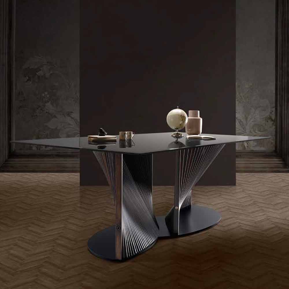 Tavolinë ngrënie me dizajn elegant nga qelqi i tymosur dhe druri, me cilësi të lartë Prodhuar në Itali.