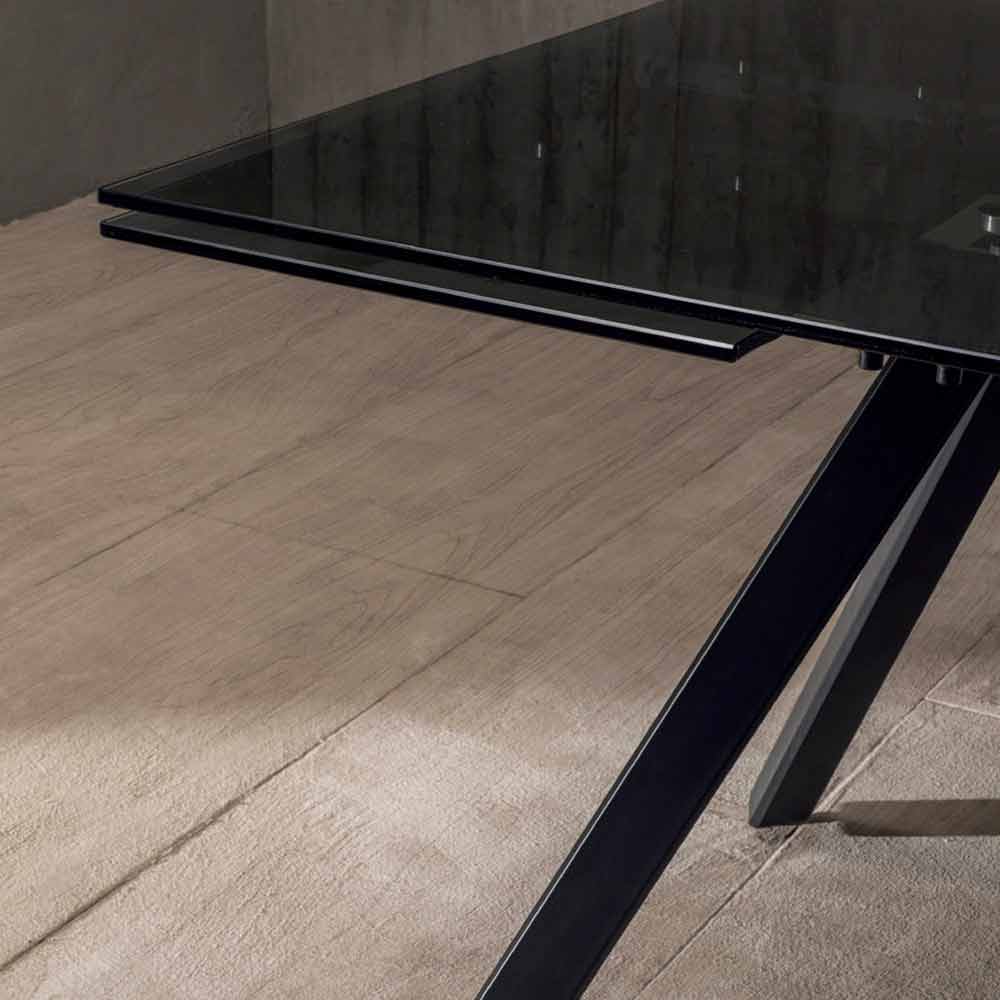 Aspekti i dizajnit të produktit jepet padyshim nga maja e qelqit të rafinuar e zbutur në fundin e zi të tymosur të tymosur të kombinuar me metalin e pikturuar me antracit mat të strukturës së karakterizuar nga veçantia e këmbëve të zhdrejtë që e bëjnë produktin unik në llojin e tij. Praktikiteti dhe funksionaliteti jepen nga mundësia e zgjatjes së pjesës së sipërme deri në 240 cm duke e lejuar atë të akomodojë maksimumi 12 persona për dreka familjare dhe darka. Kjo ndodh falë pranisë së 2zgjatimeve anësore prej 40 cm secila, gjithashtu në gotë të zezë të tymosur, të pozicionuara nën pjesën e sipërme dhe lehtësisht të lëvizshme kur është e nevojshme.