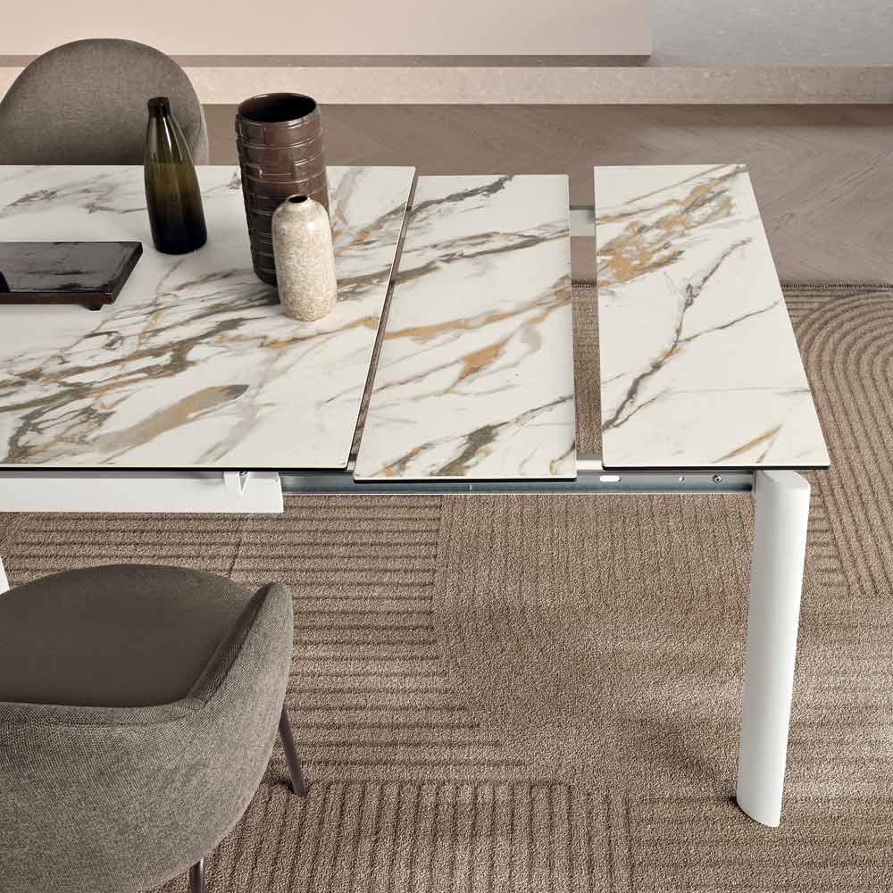 I pajisur me dy gjethe zgjatuese 30 cm , ju lejon të zgjeroni sipërfaqen kur është e nevojshme, duke qenë i përshtatshëm në mënyrë të përkryer për të pritur dreka dhe darka. I disponueshëm në dy madhësi dhe kombinime të ndryshme të sipërfaqes dhe bazës, ai integrohet lehtësisht në mjediset moderne.