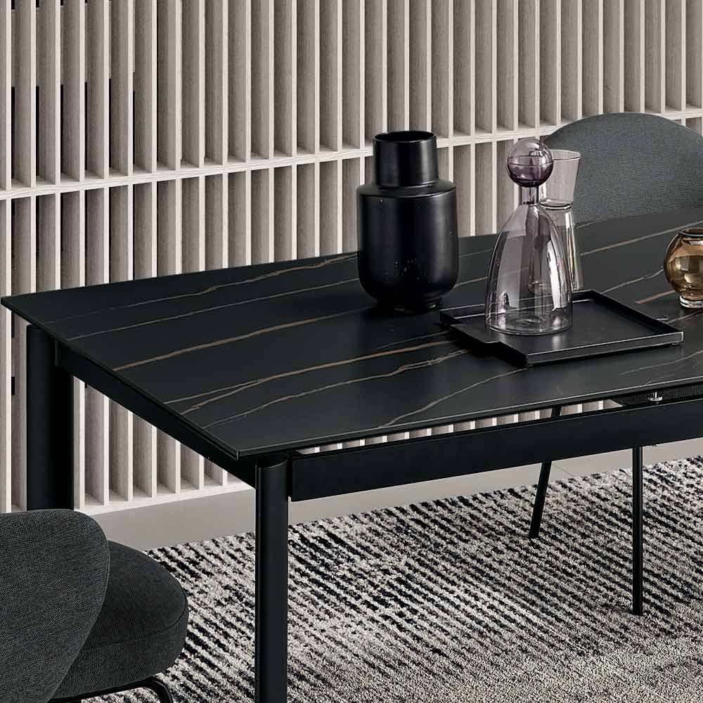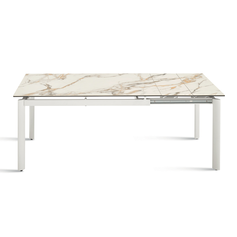 Një tavolinë elegante e zgjerueshme me një dizajn minimalist, ideale për t'i shtuar një prekje elegante dhomës suaj të ngrënies ose dhomës së ndenjes . Korniza metalike e lyer mbështet një sipërfaqe të rafinuar prej porcelani me efekt mermeri , e projektuar për përdorim praktik dhe të gjithanshëm të përditshëm.