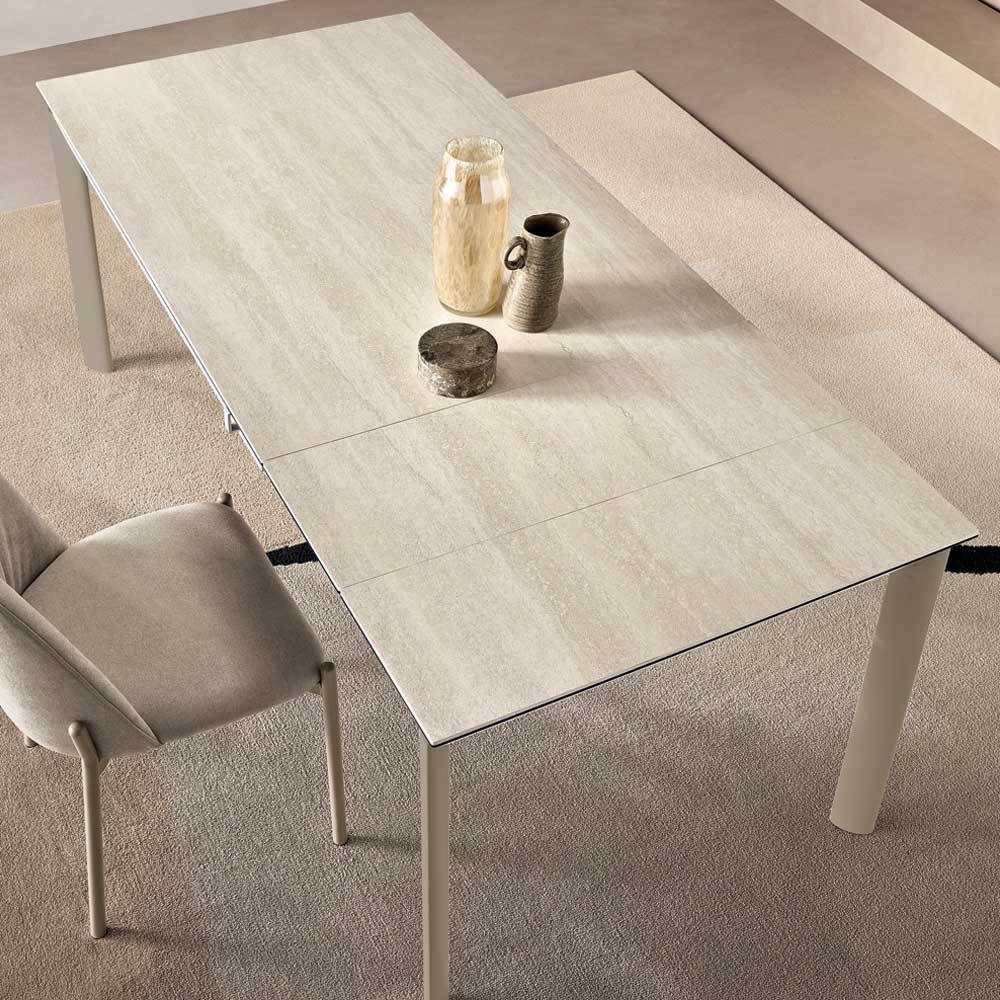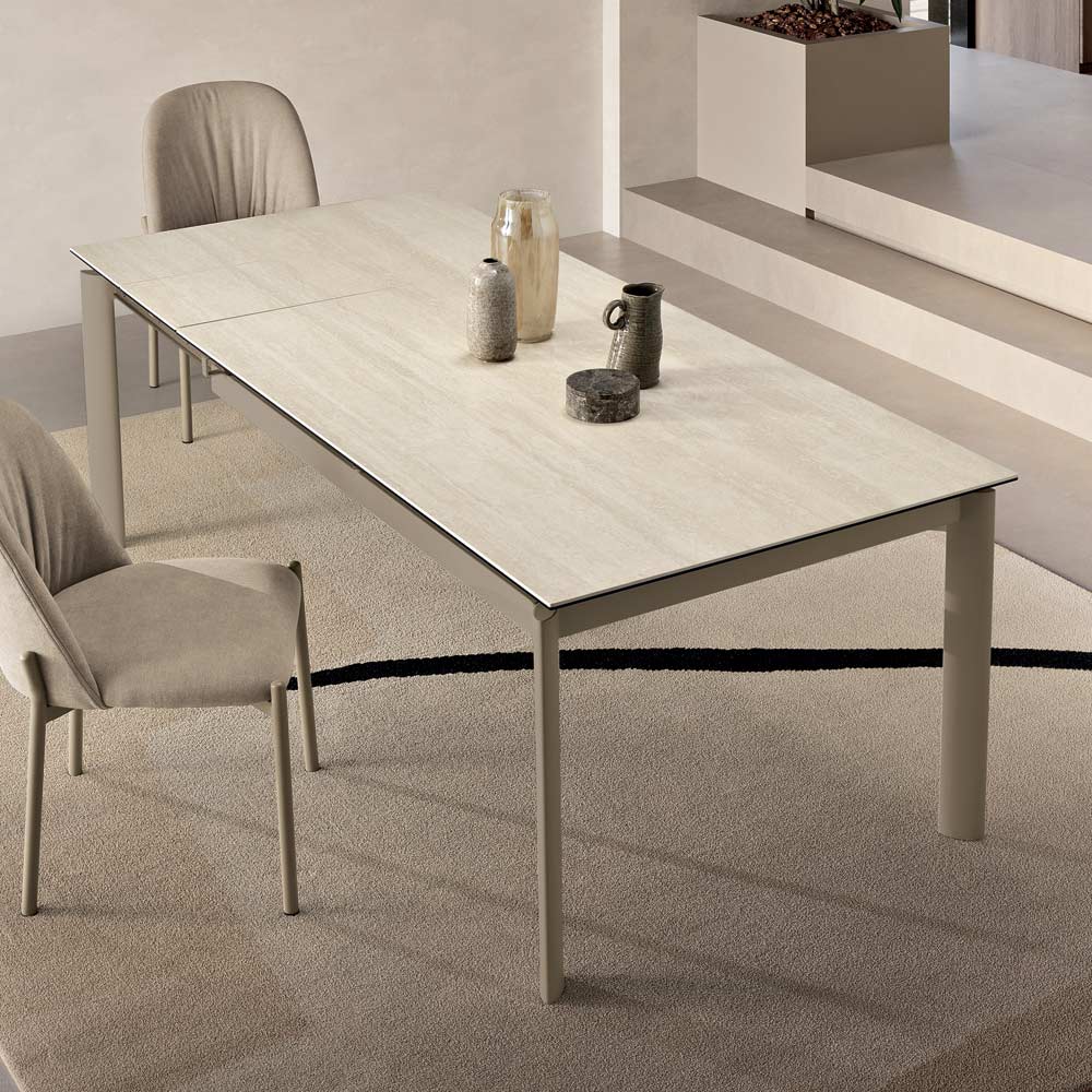 Këmbët e pozicionuara në cepa lirojnë hapësirë nën pjesën e sipërme, duke përmirësuar rehatinë e uljes dhe duke i dhënë estetikë të pastër tavolinës. Pjesa e sipërme duket pak e ngritur për të akomoduar në mënyrë diskrete gjethet zgjatuese, duke ruajtur një pamje të rregullt edhe kur është e mbyllur.