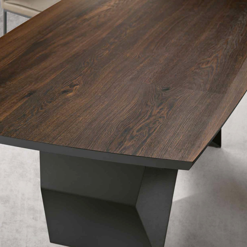 Këmbët metalike , me një formë të theksuar gjeometrike, janë të lyera për të bërë kontrast të bukur me tonin e drurit. Ky kombinim i materialeve jo vetëm që siguron stabilitet të fortë, por gjithashtu shton një element vizual me ndikim, duke e bërë këtë tryezë një pikë qendrore të vërtetë në çdo dhomë ngrënie apo zonë me plan të hapur.
