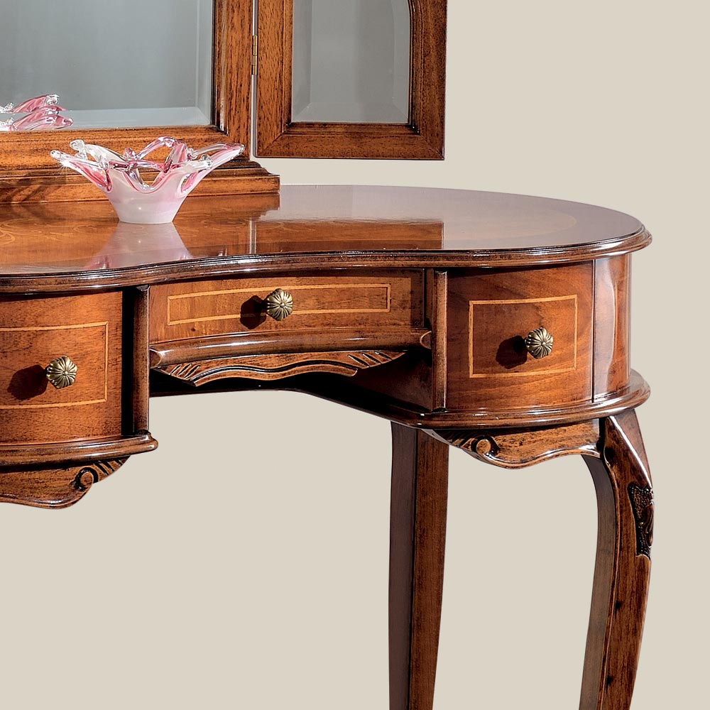 Kjo tavolinë zhveshjeje e rafinuar me 3 sirtarë dhe pasqyrë ështëidealepër të mobiluar dhomën e gjumitme një stil klasik të përjetshëm. I gjithë stili dhe mjeshtëria që karakterizon mjeshtërinë shfaqen në këtë pjesë të kushtueshme të mobiljeve të bëra me dru të çmuar në finiture arre ose të bardhë me veshje të artë që e bëjnë atë një plotësues të rafinuar të aftë për të zbukuruar mjedisin në të cilin është vendosur. Prodhuar tërësisht në Itali dhe punuar me dorë nga mjeshtra të aftë , të përfunduara me mençuri dhe shije për elegancë. Prodhimi kryhet duke përdorur materiale të shkëlqyera , dhe duke kryer punënmedorë me kujdesin dhe profesionalizmin maksimal që i dallon produktet Made in Italy .