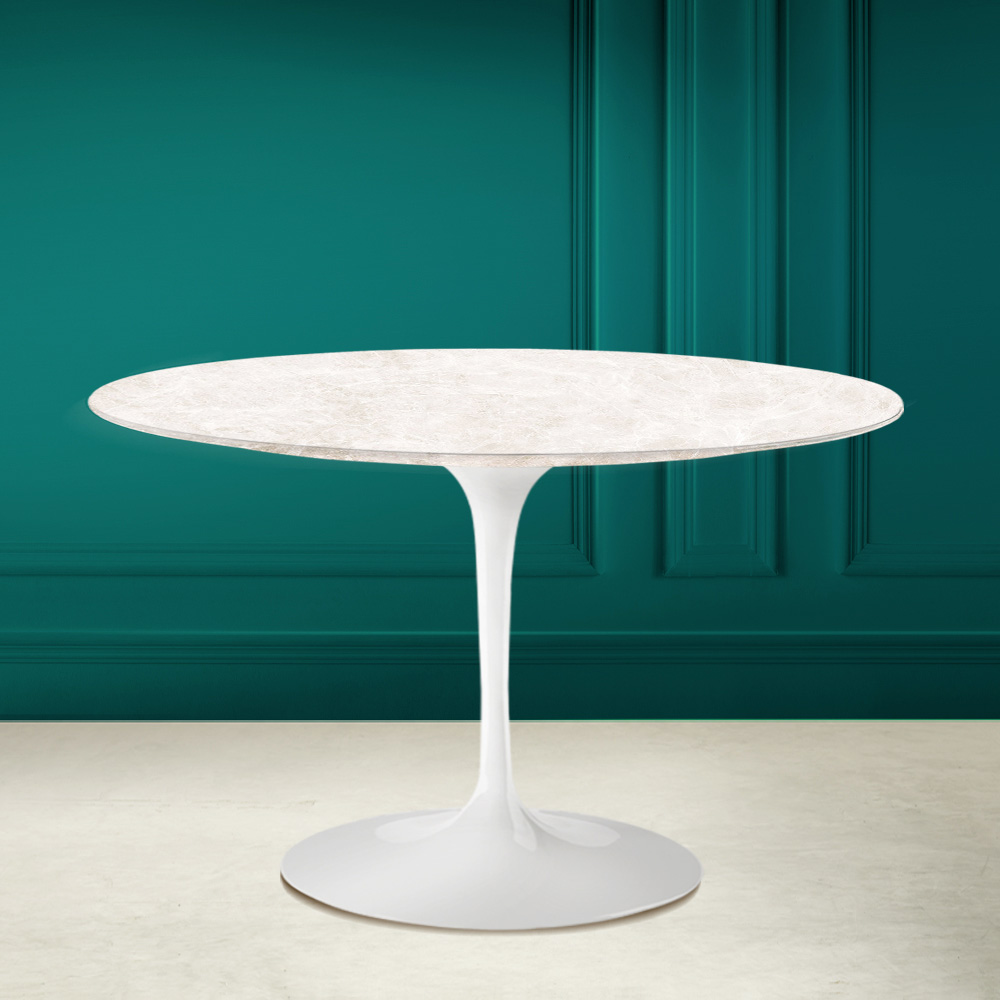 Tavolinë ngrënieje me majë të rrumbullakët në qeramikë krem diamanti, efekt guri ngjyrë bezhë mat dhe bazë alumini të lëmuar tërësisht Prodhuar në Itali.Përfundimet lineare dhe të rafinuara krijojnë një element që është i lehtë për t'u futur në çdo stil arredimi të çdo dhome ndenjeje dhe kuzhine. Bashkimi midis qeramikës krem diamanti dhe aluminit të lëmuar e bën këtë tryezë të përshtatshme për të gjitha situatat dhe rastet e përdorimit, duke krijuar një dhomë unike dhe mikpritëse. Fjalët kyçe për të përshkruar këtë produkt janë prakticiteti dhe funksionaliteti pa harruar elegancën e dhënë nga ngjyra dhe grafika e veçantë e qeramikës krem diamanti.