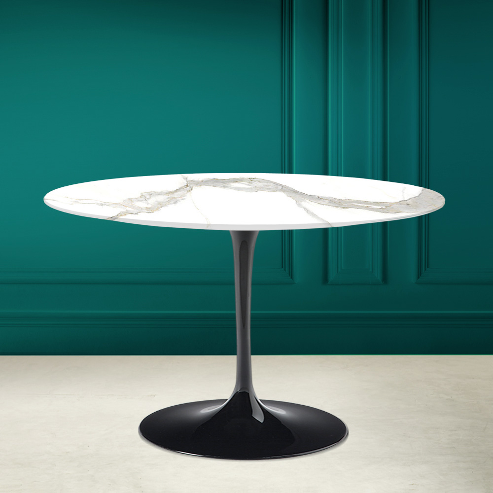 Tavolinë ngrënieje me majë të rrumbullakët në qeramikë Calacatta Michelangelo, efekt mermeri mat Calacatta dhe bazë alumini të lëmuar tërësisht Prodhuar në Itali.Përfundimet lineare dhe të rafinuara krijojnë një element që është i lehtë për t'u futur në çdo stil arredimi të çdo dhome ndenjeje dhe kuzhine. Bashkimi midis qeramikës Calacatta Michelangelo dhe aluminit të lëmuar e bën këtë tryezë të përshtatshme për të gjitha situatat dhe rastet e përdorimit, duke krijuar një dhomë unike dhe mikpritëse. Fjalët kyçe për të përshkruar këtë produkt janë prakticiteti dhe funksionaliteti pa harruar elegancën e dhënë nga ngjyra dhe grafika e veçantë e qeramikës Calacatta Michelangelo.