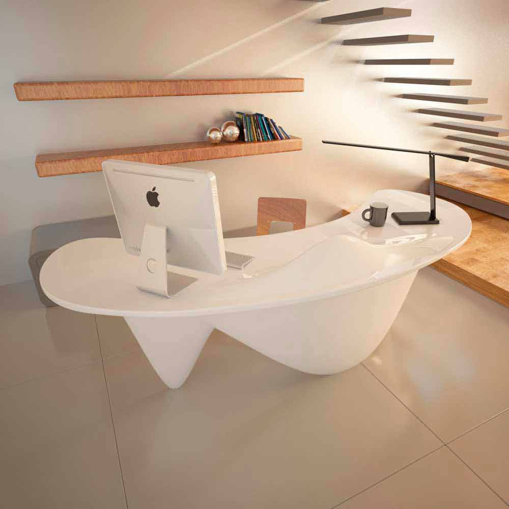Ideja bëhet Materie. Materiali: Sipërfaqja e ngurtë; Dizajn nga Rosaria Colonna dhe materiale inovative për një objekt që synon të bëhet qendra funksionale dhe estetike e një zyre të rëndësishme. Është bërë nga Solid Surface, një rrëshirë që tani është lider në sektorin italian të mobiljeve. Fund me llak me shkëlqim E disponueshme në variacione të ndryshme ngjyrash.
