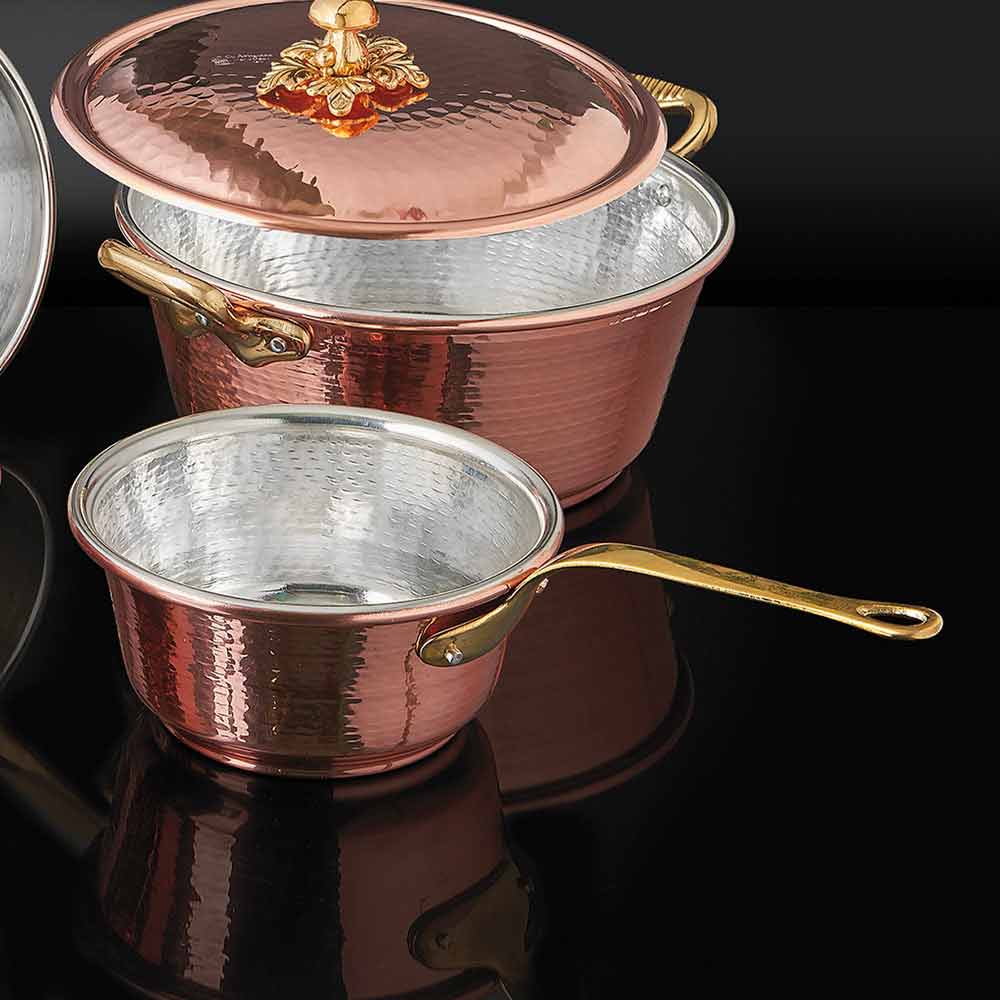 materiale me cilësi të shkëlqyer. Pra bakri i përdorur është bakër i pastër, me cilësitë e duhura fizike për modelim perfekt. Tunxhi për dorezat vjen nga shufra individuale të zgjedhjes së parë për derdhje artizanale dhe kallaji i përdorur është 100% i pastër i virgjër i përshtatshëm për përdorim ushqimor, në përputhje me rregulloret dhe me një certifikatë analize.