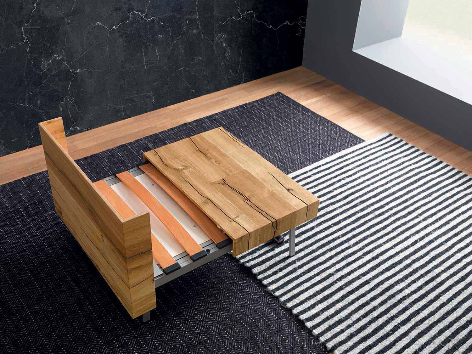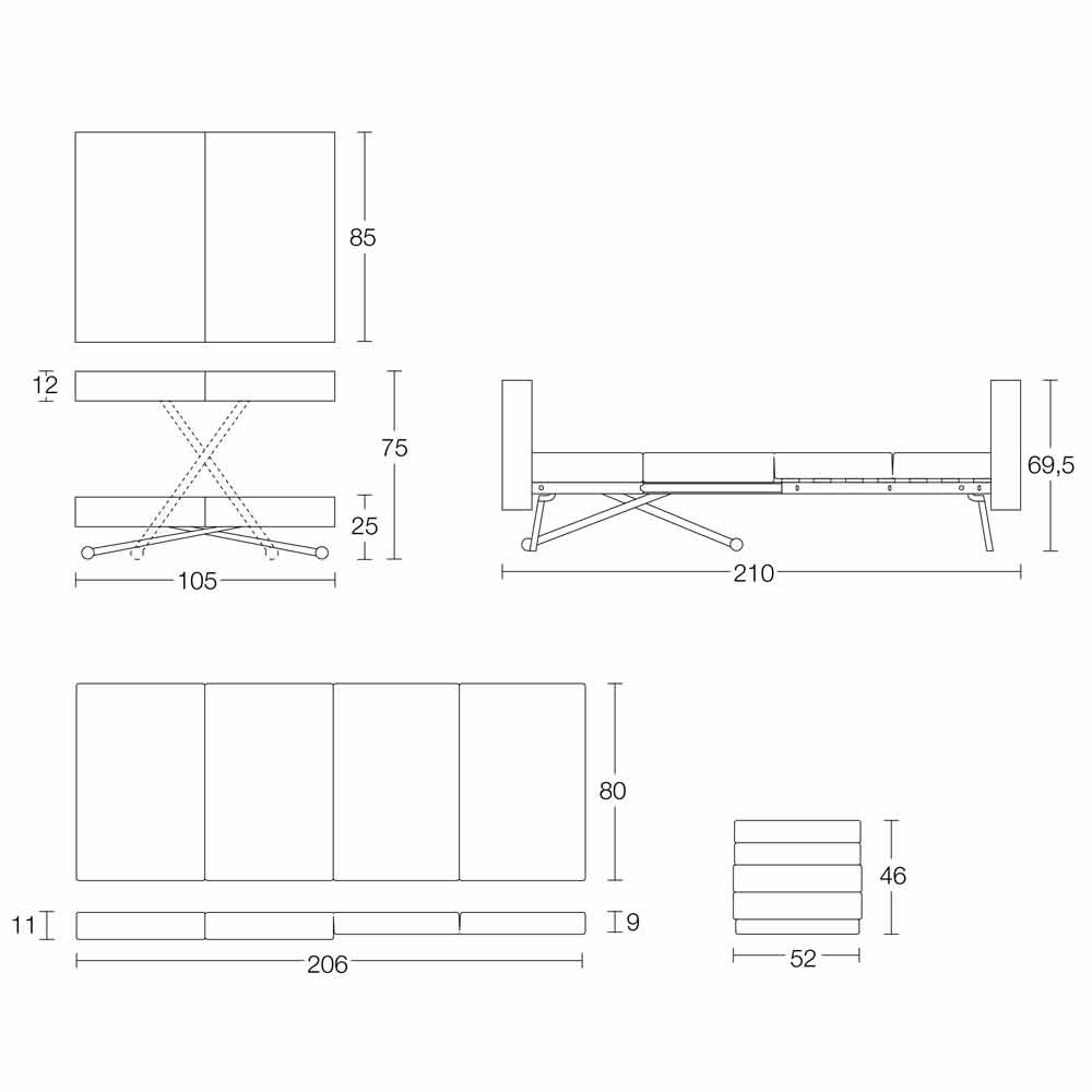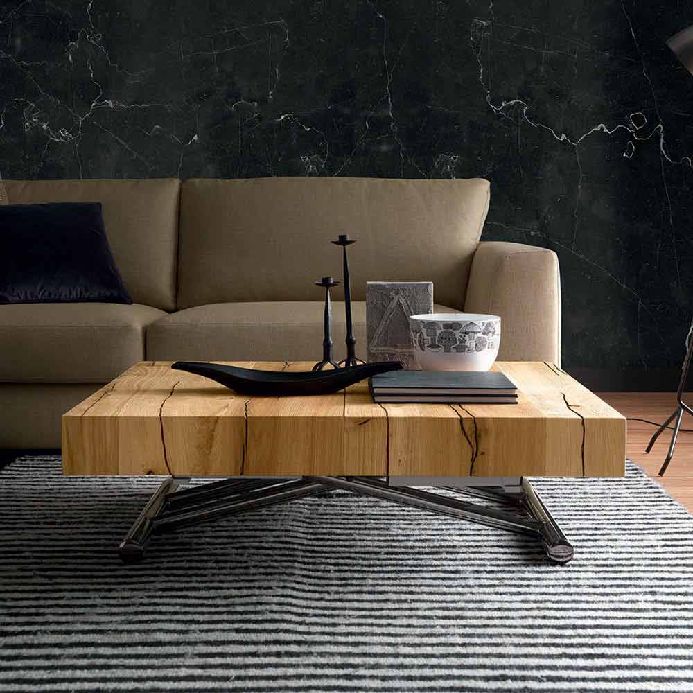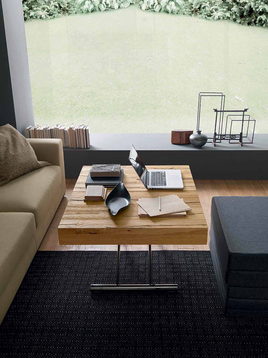 tavolinë kafeje e transformueshme karakterizohet nga linja elegante dhe të gjithanshme të aftë për të lëvizur në lartësi për të përmbushur funksionin e një tavoline ngrënieje e cila, nëse është e nevojshme, evoluon duke i dhënë formë një shtrati të rehatshëm me dizajn të rafinuar.