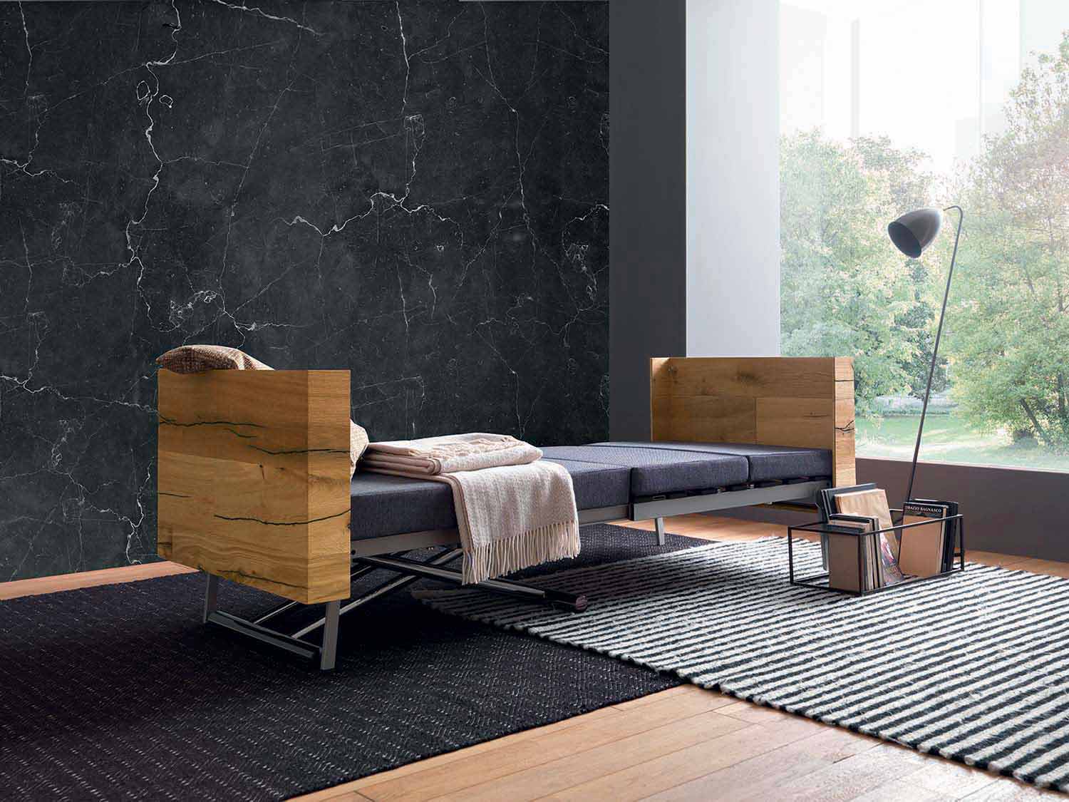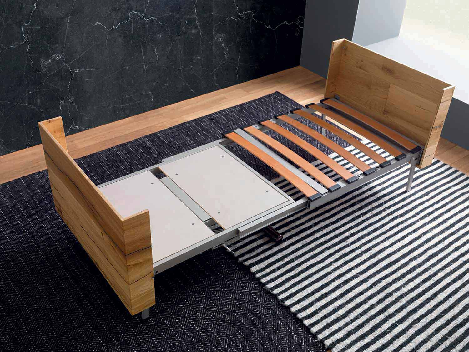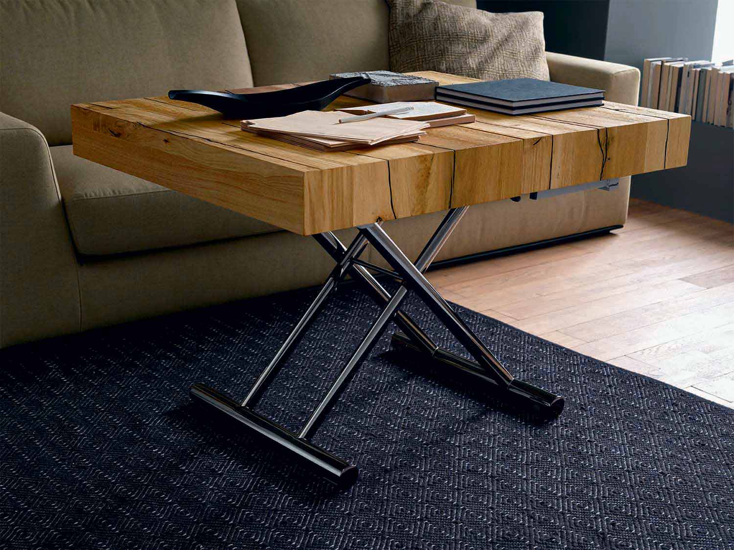 tavolinë kafeje e transformueshme karakterizohet nga linja elegante dhe të gjithanshme të aftë për të lëvizur në lartësi për të përmbushur funksionin e një tavoline ngrënieje e cila, nëse është e nevojshme, evoluon duke i dhënë formë një shtrati të rehatshëm me dizajn të rafinuar.