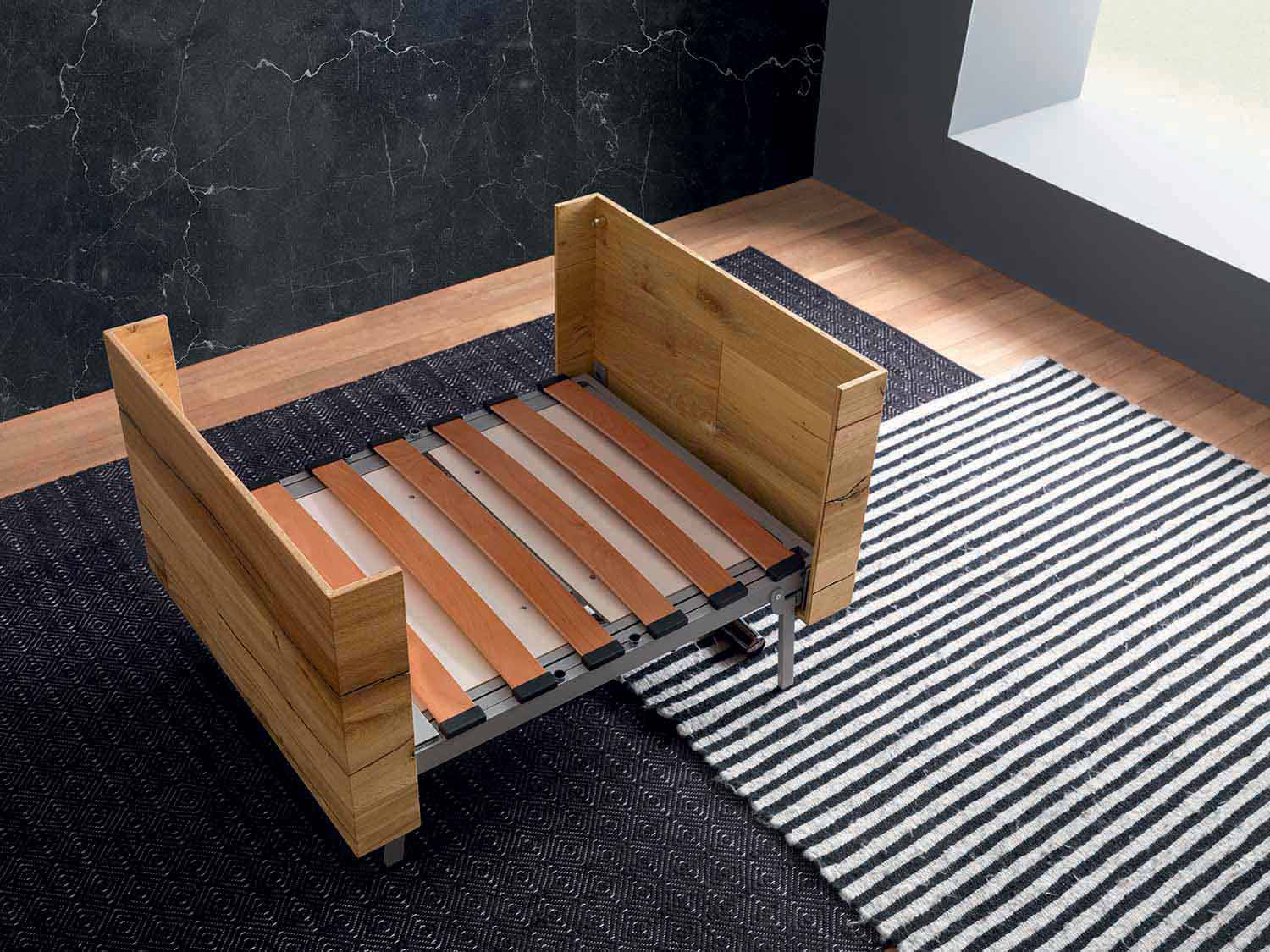 E pajisur me poff që mund të shndërrohet në dyshek (shkumë poliuretani D 35 rezistente ndaj zjarrit), e mbuluar me pëlhurë gri. Baza me shirita dhe panel kompensatë. Këmbët mbështetëse të palosshme. Tavoletto