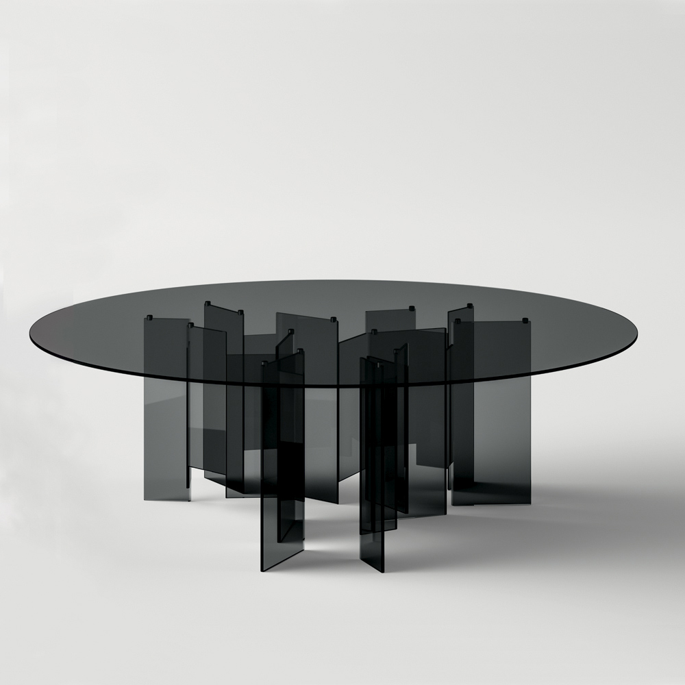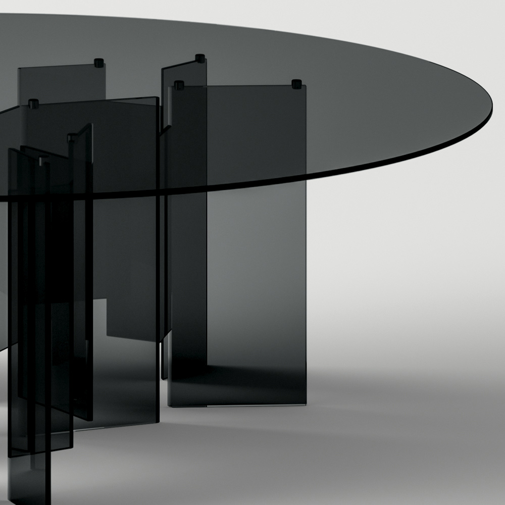 Tavoline ngrenie komplet prej xhami me baza e formave gjeometrike e cila mbështet një majë elegante të rrumbullakët . Një zgjidhje mobilimi që vjen nga një proces prodhimi Made in Italy nëpërmjet përpunimit ekspert të qelqit nga mjeshtrit të aftë që lejojnë t'i japin jetë kombinimit të përsosur të cilësisë , dizajnit dhe funksionalitetit .