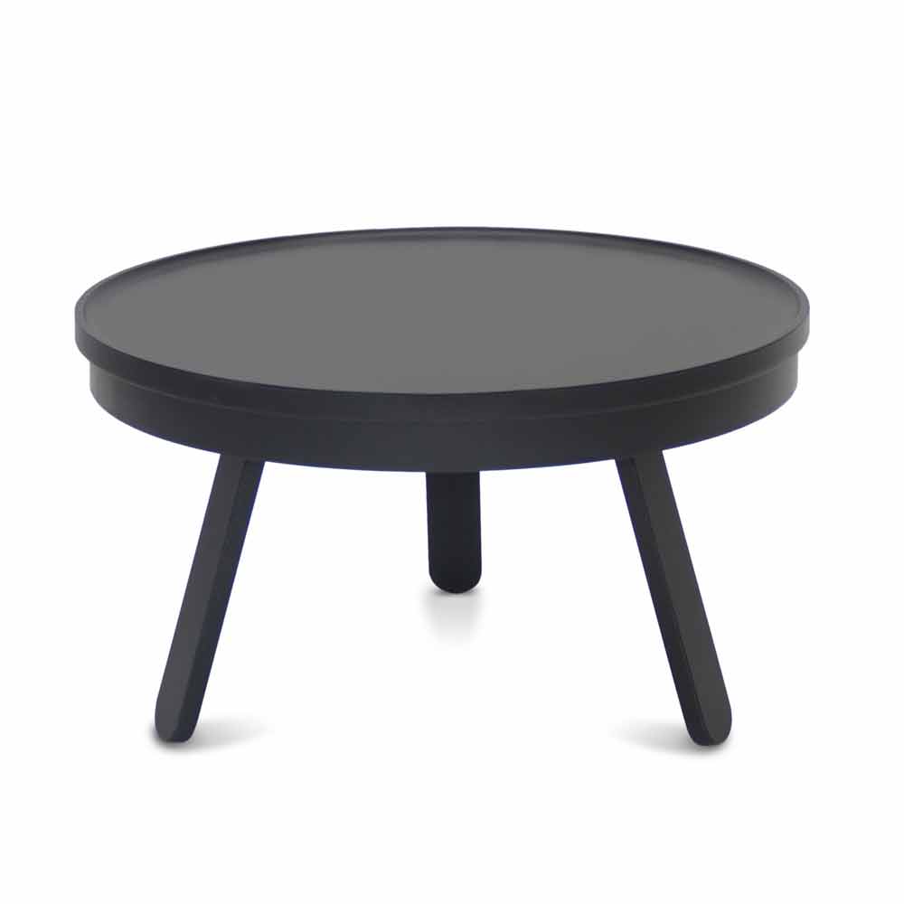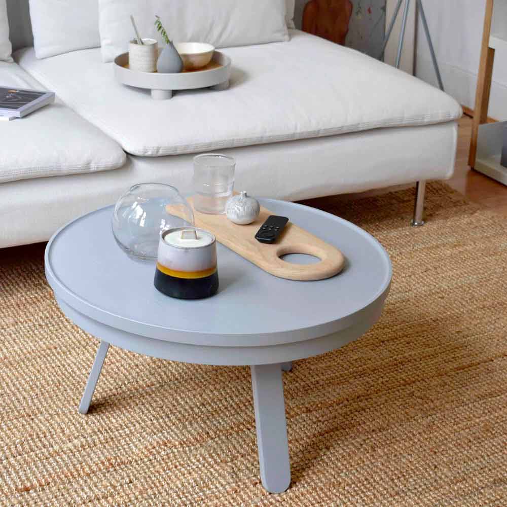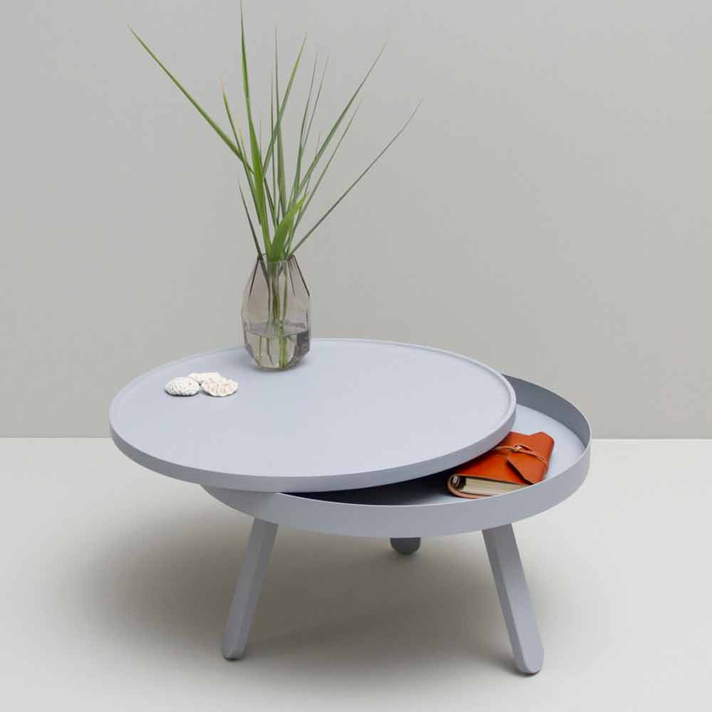 Tryezë e rrumbullakët kafeje prej druri dhe çeliku me ndarje magazinimi.