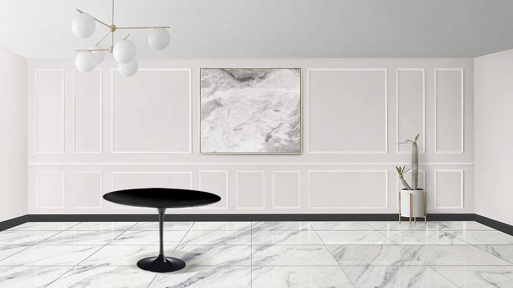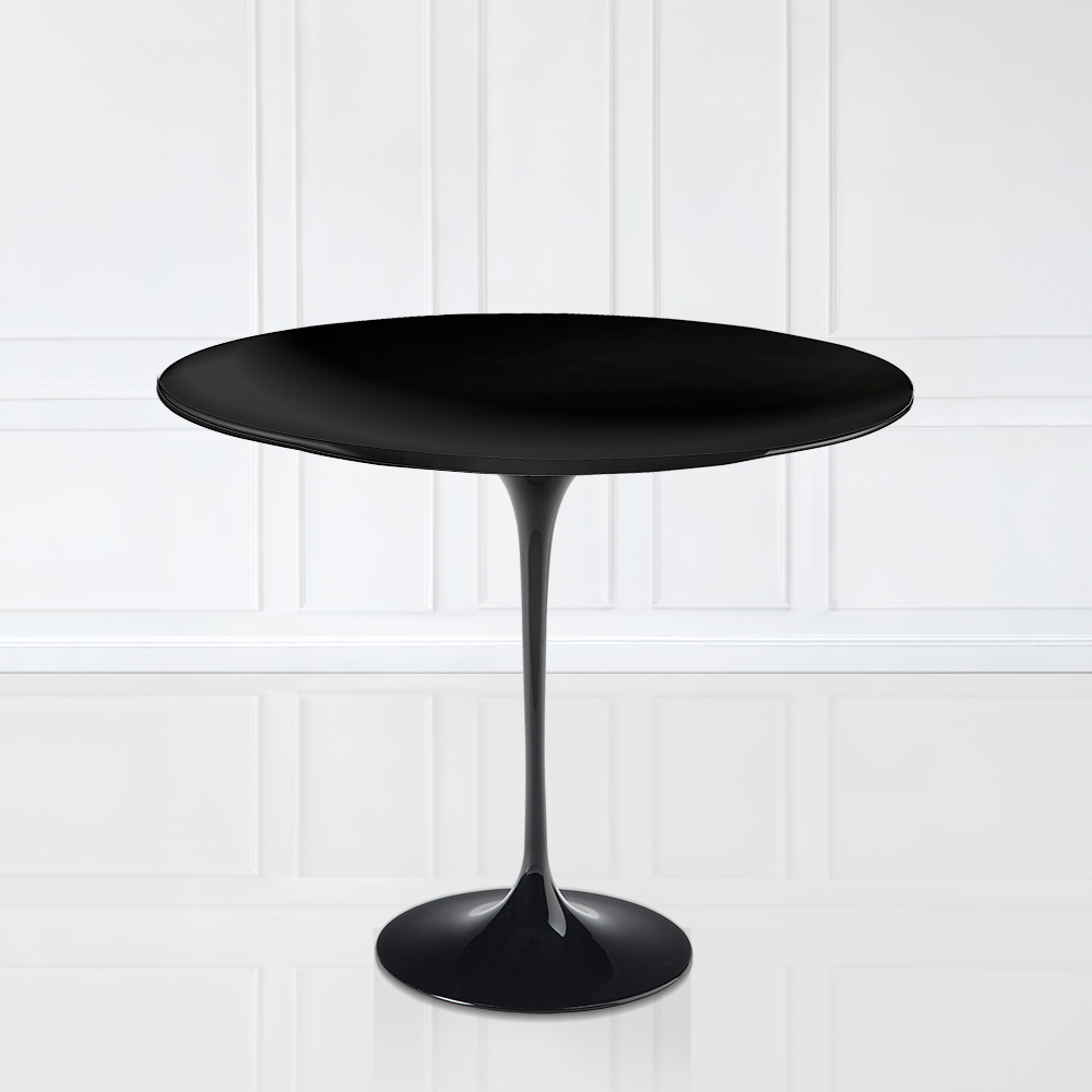 Tavolinë ngrënie tërësisht e prodhuar në Itali me majë të rrumbullakët në laminat të lëngshëm të zi dhe bazë prej alumini të lustruar të zi . Dizajni joshëse dhe i rafinuar i këtij elementi ju mundëson të arredoni çdo lloj ambienti të jetesës dhe kuzhinës me shije dhe rafinim falë formës së rrumbullakët e cila i jep një prekje origjinaliteti dhomës duke i dhënë freski dhe linearitet stilit. Është thelbësore të zgjidhni tavolinën e ngrënies me kujdes pasi ajo vendoset në vendin më të ngrohtë dhe mikpritës në shtëpi dhe duhet të krijojë një përzierje perfekte me ambientin përreth: shkathtësia e kësaj tavoline lejon që ajo të bëhet në çdo vend. Ky element arredimi është ideal për të kompletuar çdo dhomë me maturi falë përfundimeve të thjeshta dhe thelbësore. Pjesa e sipërme e laminuar e lëngshme dhe baza e lëmuar prej alumini e bëjnë këtë tryezë të përshtatshme dhe funksionale për çdo rast përdorimi.