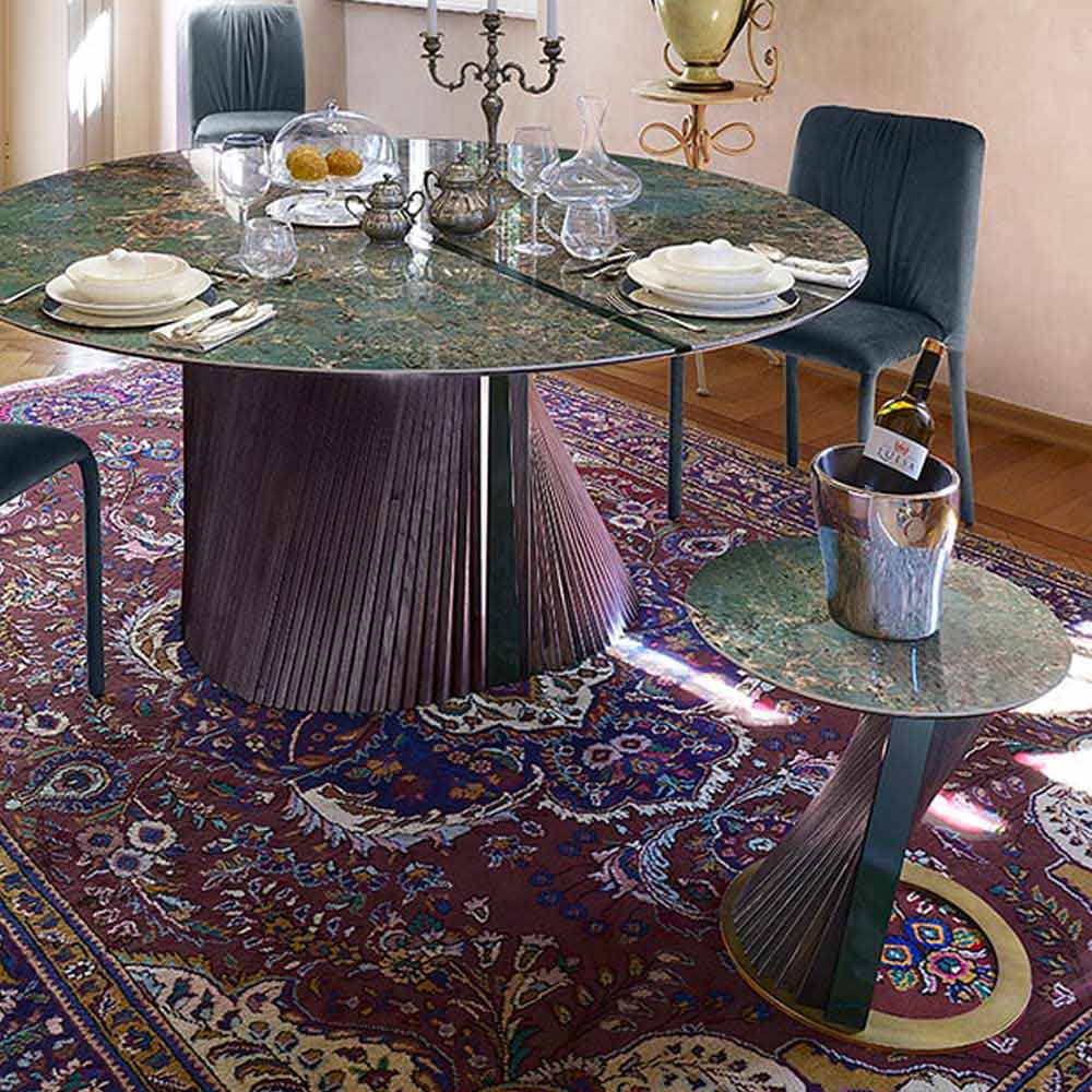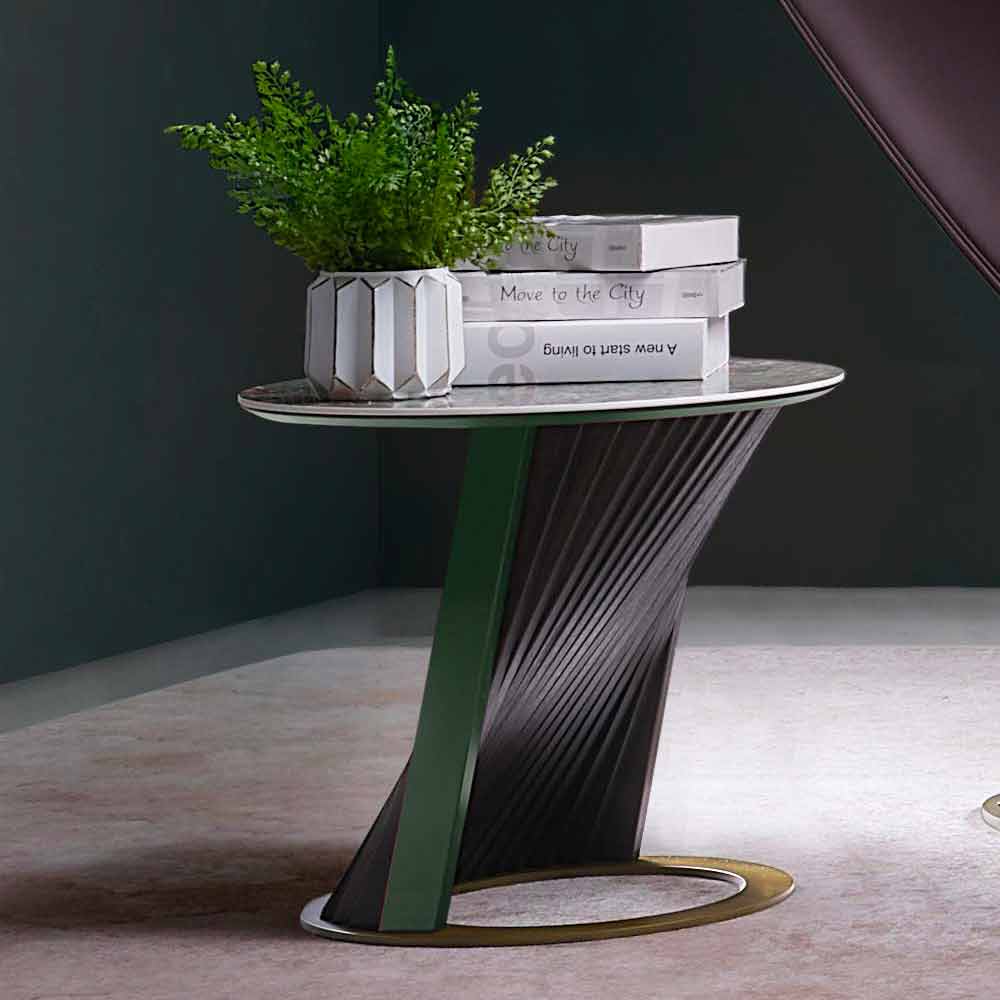 Dizajnoni tryezë kafeje me majë të rrumbullakët në prodhim gresi me efekt mermeri, send luksoz Prodhuar në Itali.