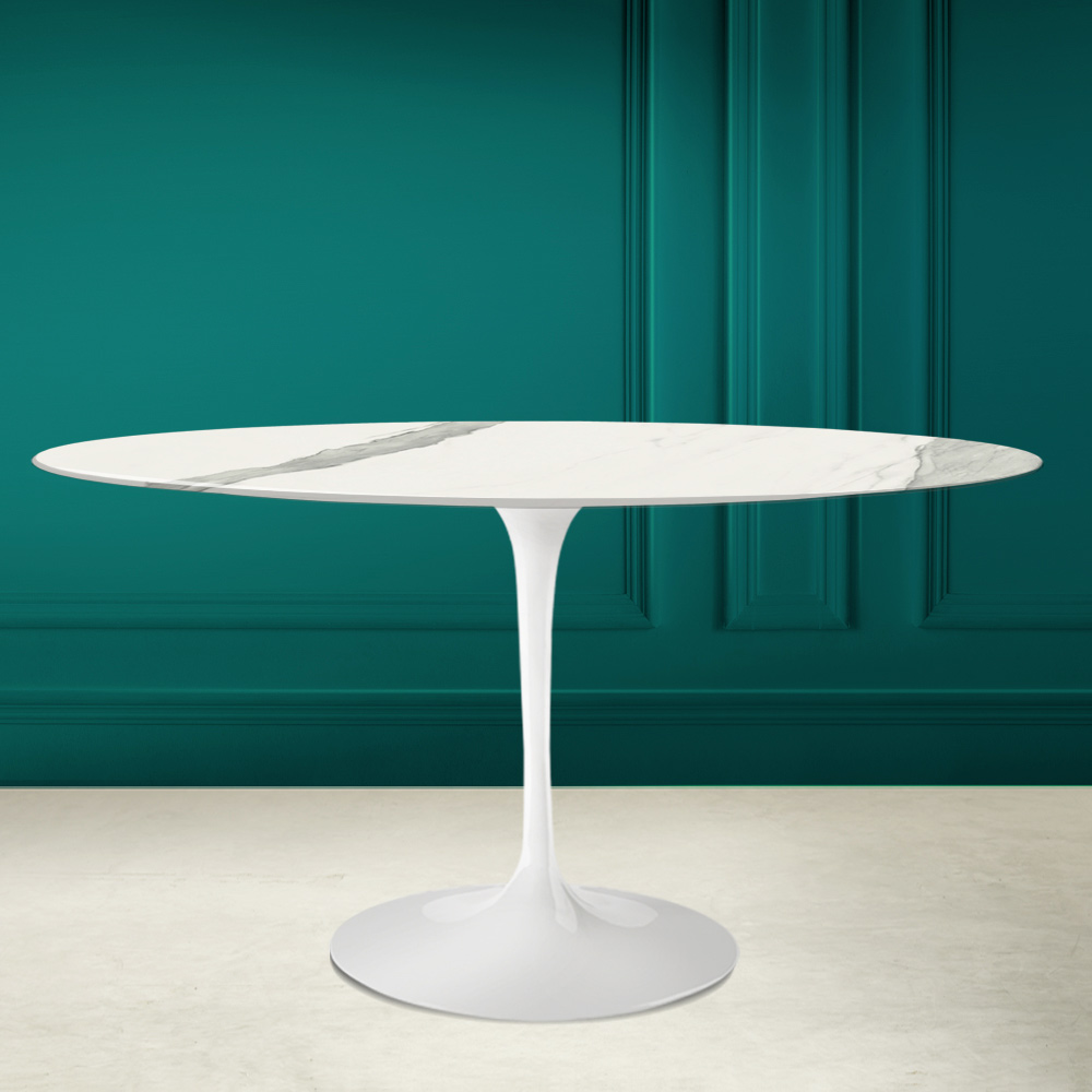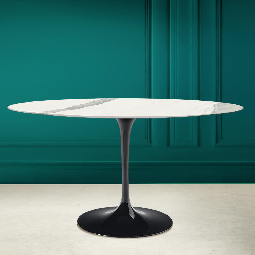 Tavolinë ngrënieje tërësisht e prodhuar në Itali me majë ovale në qeramikë statuore me venë të plotë, efekt statujash mat dhe bazament alumini të lëmuar. Kjo tryezë është elementi i përsosur për t'i dhënë një prekje origjinale çdo dhome ndenjeje dhe kuzhine falë formës së saj ovale dhe qeramikës me venë të plotë. Forma ovale përdoret gjithnjë e më shumë për tavolinat e ngrënies pasi mundëson prakticitet dhe funksionalitet të madh dhe jep një prekje inovative falë linjës së re dhe të rafinuar. Qeramika statuario me venë të plotë karakterizohet nga vena të gjalla dhe komplekse që janë të përshtatshme për të kompletuar stilin e çdo dhome, nga moderne në atë bashkëkohore.