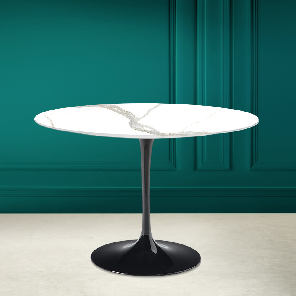 Tavolinë ngrënie tërësisht Prodhuar në Itali me majë të rrumbullakët në qeramikë Calacatta Michelangelo, efekt mermeri mat Calacatta dhe bazë alumini të lëmuar. Kjo tryezë arrin të kombinojë funksionalitetin dhe prakticitetin me elegancën dhe përsosmërinë falë përfundimeve të thjeshta dhe qeramikës së veçantë Calacatta Michelangelo. Produkti ka një formë lineare dhe të rafinuar që e bën atë të përshtatshëm për kompletimin e arredimit të çdo dhome ndenjeje dhe kuzhine, duke i dhënë një prekje unike. Qeramika Calacatta Michelangelo ka një ngjyrë dhe grafikë shumë komplekse dhe të sofistikuara që e bëjnë dhomën mikpritëse dhe të paharrueshme. Kjo tavolinë është ideja perfekte për të arreduar çdo vend me shije dhe, në të njëjtën kohë, lehtësi në përdorim .