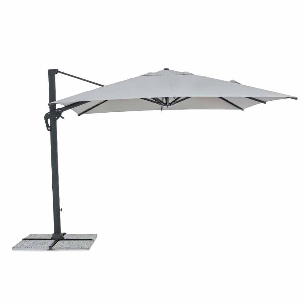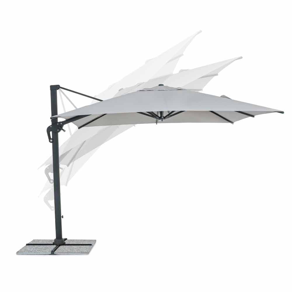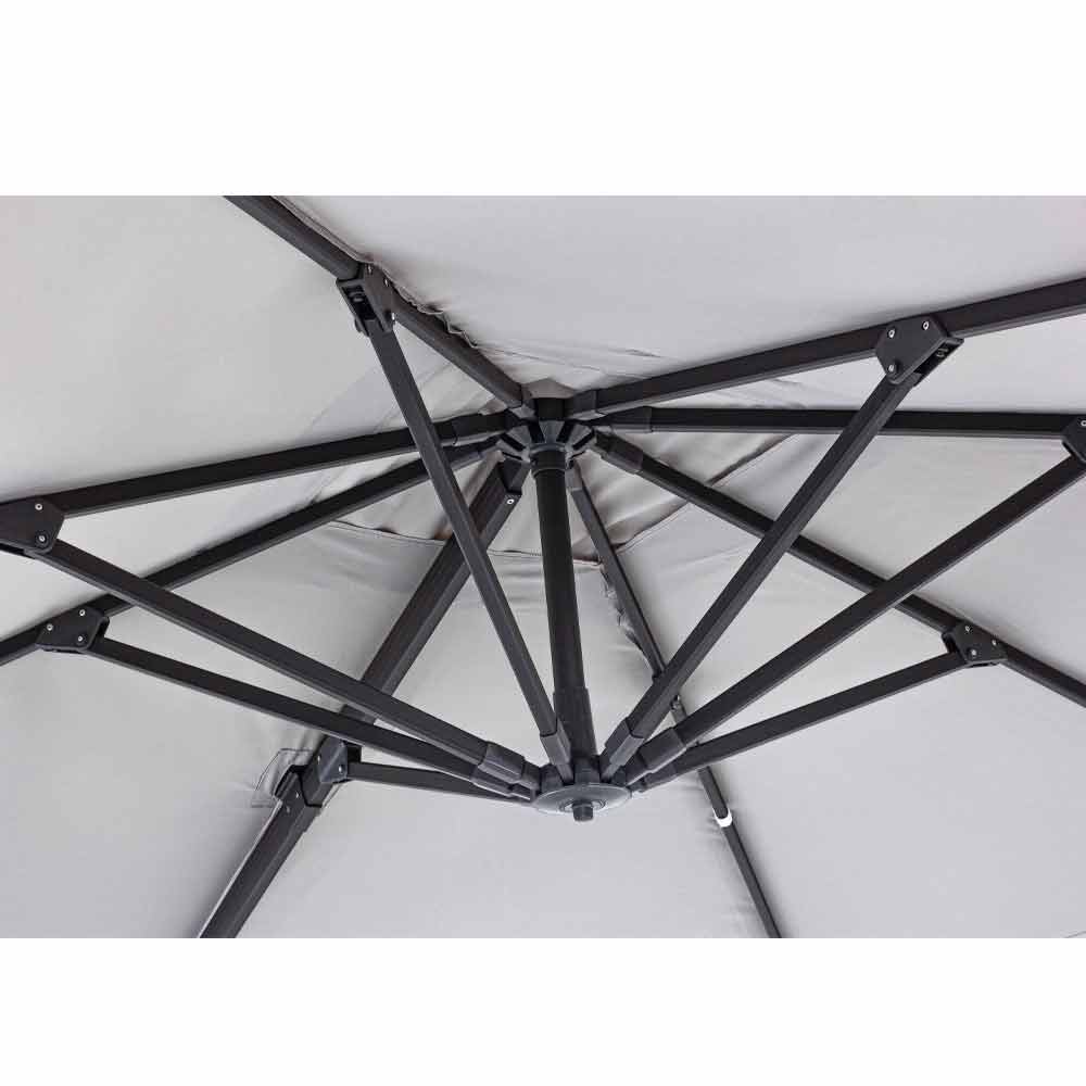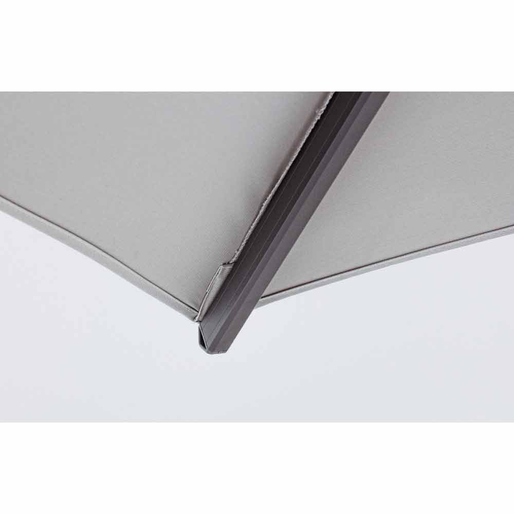 Struktura alumini e veshur me pluhur (poliester). Shtylla 93x57mm. 8 brinjë 28x18mm. Pëlhurë poliester gri e lehtë 250gr / m2 me veshje pa (poliamide). Baza kryq në çelik . Pol rrotullues 360 ° me pedale. Pjerrësia vertikale me dorezë me 5 pozicione. Përfshirë mbulesën e ombrellës.
