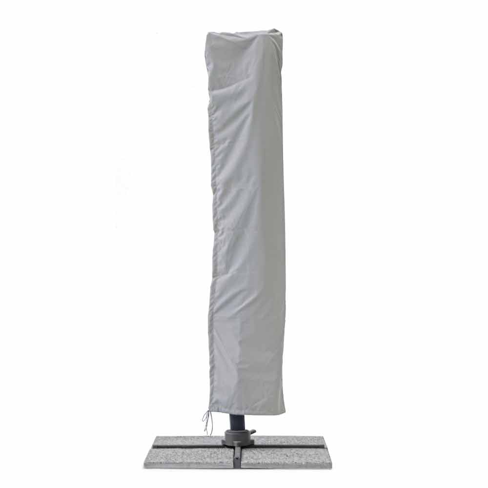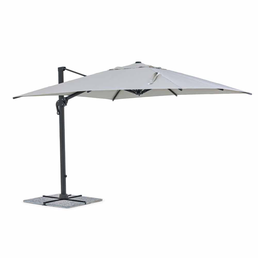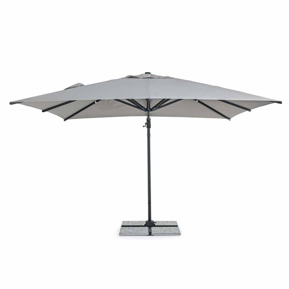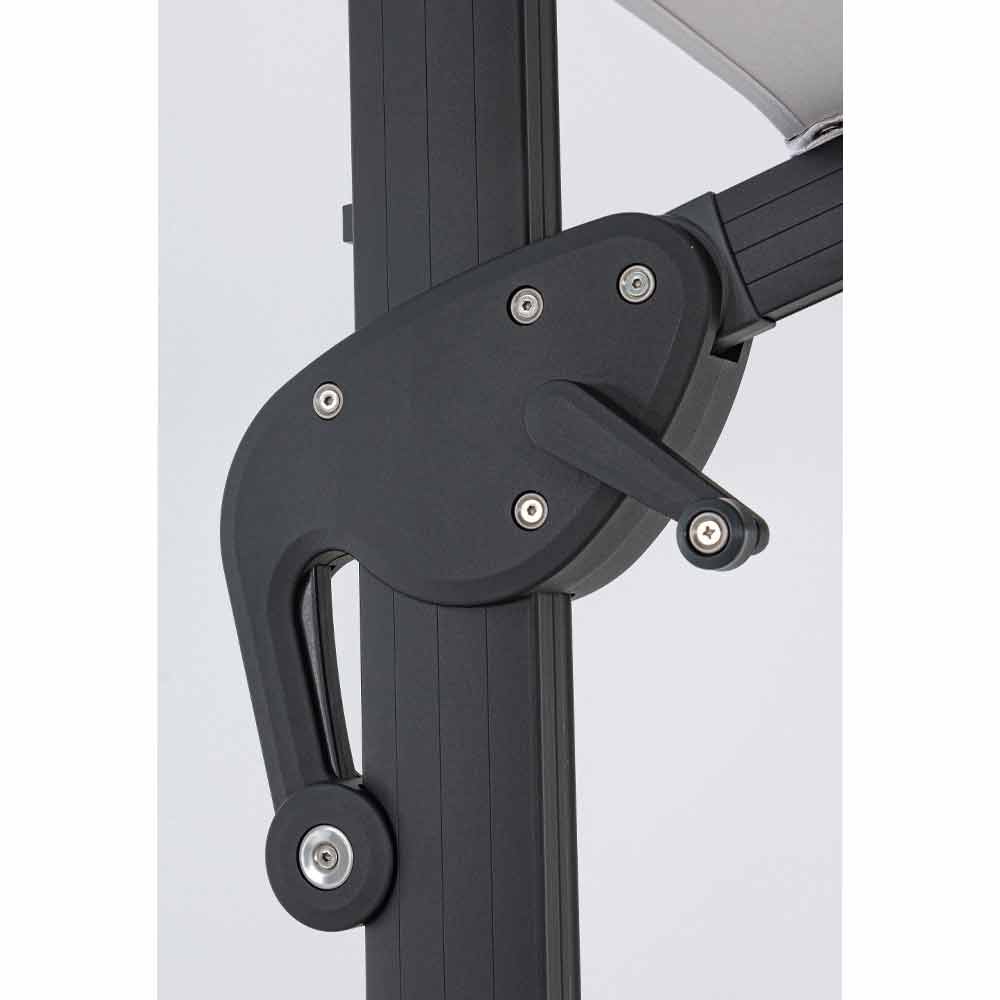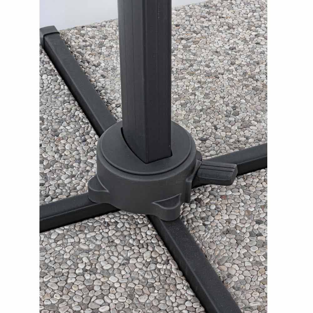 Struktura alumini e veshur me pluhur (poliester). Shtylla 93x57mm. 8 brinjë 28x18mm. Pëlhurë poliester gri e lehtë 250gr / m2 me veshje pa (poliamide). Baza kryq në çelik . Pol rrotullues 360 ° me pedale. Pjerrësia vertikale me dorezë me 5 pozicione. Përfshirë mbulesën e ombrellës.
