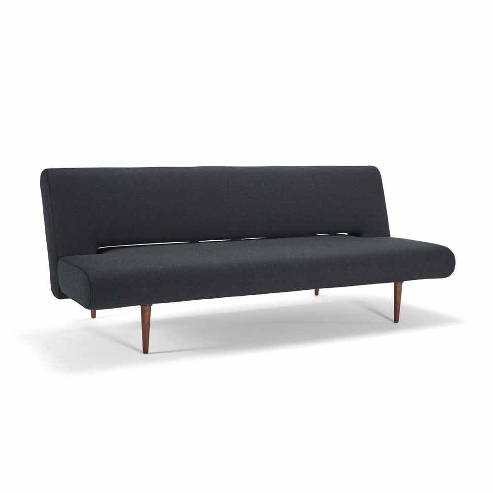 Unfurl është krevat divan që vjen me një strukturë çeliku të zezë mat dhe këmbë prej druri me njolla të errëta.