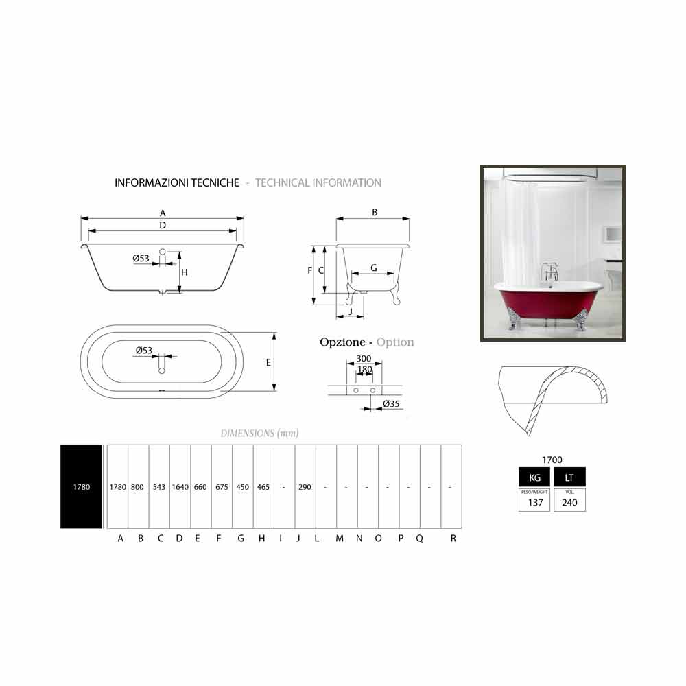 Vaskë e pavarur tërësisht prej gize. Finim i brendshëm i smaltuar me titan 2 mm dhe i jashtëm i lyer me variacione të ndryshme kromatike; kompletuar me kembe prej gize te dekoruara dhe me ngjyra. Vaska që përfaqëson majën e luksit!