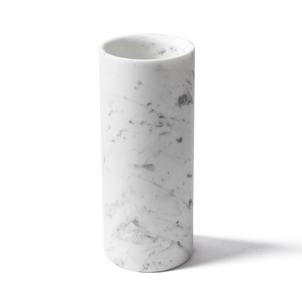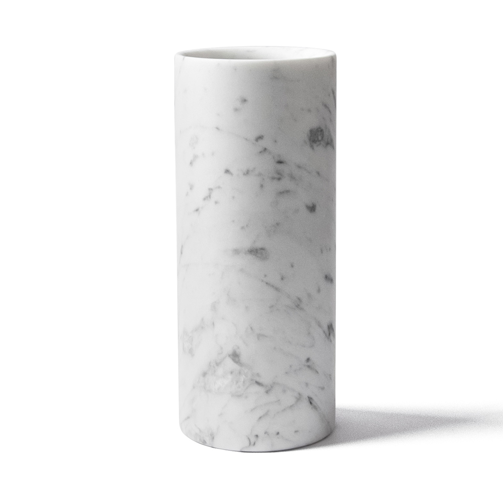 Vazo e punuar me dorë në dizenjo cilindrike prej mermeri të bardhë Carrara e prodhuar në Itali.