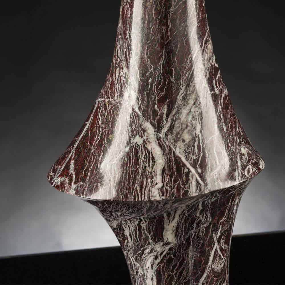 Vazo elegante për ambiente të brendshme në mermer të kuq Antico d'Italia, një material prestigjioz ngjyrë vjollcë e errët me damarë në hije jeshile dhe të bardhë të bërë përmes një prodhimi 100% Made in Italy . Prodhimi i tij bëhet përmes përpunimit të gurëve natyrorë me pantografë me 5 boshte që lejojnë marrjen e formave më komplekse sesa vëllimet e thjeshta të rrotullimit. Kjo mobilje elegante vjen nga bashkimi midis studimit të fenomeneve natyrore dhe bashkëveprimit të materialeve të përdorura me teknologjinë njerëzore për t'i dhënë jetë një stili unik dhe avangard të mobiljeve. Rezultati është një element dekorativ ekskluziv i aftë të pasurojë çdo ambient me një estetikë moderne dhe të rafinuar me personalitet. Një stil ideal për ambientet më të larmishme, nga orenditë e shtëpive deri tek ato të hoteleve, restoranteve, zonave të kontraktuara, llixhave por edhe si një mjedis për ngjarje dhe dasma.