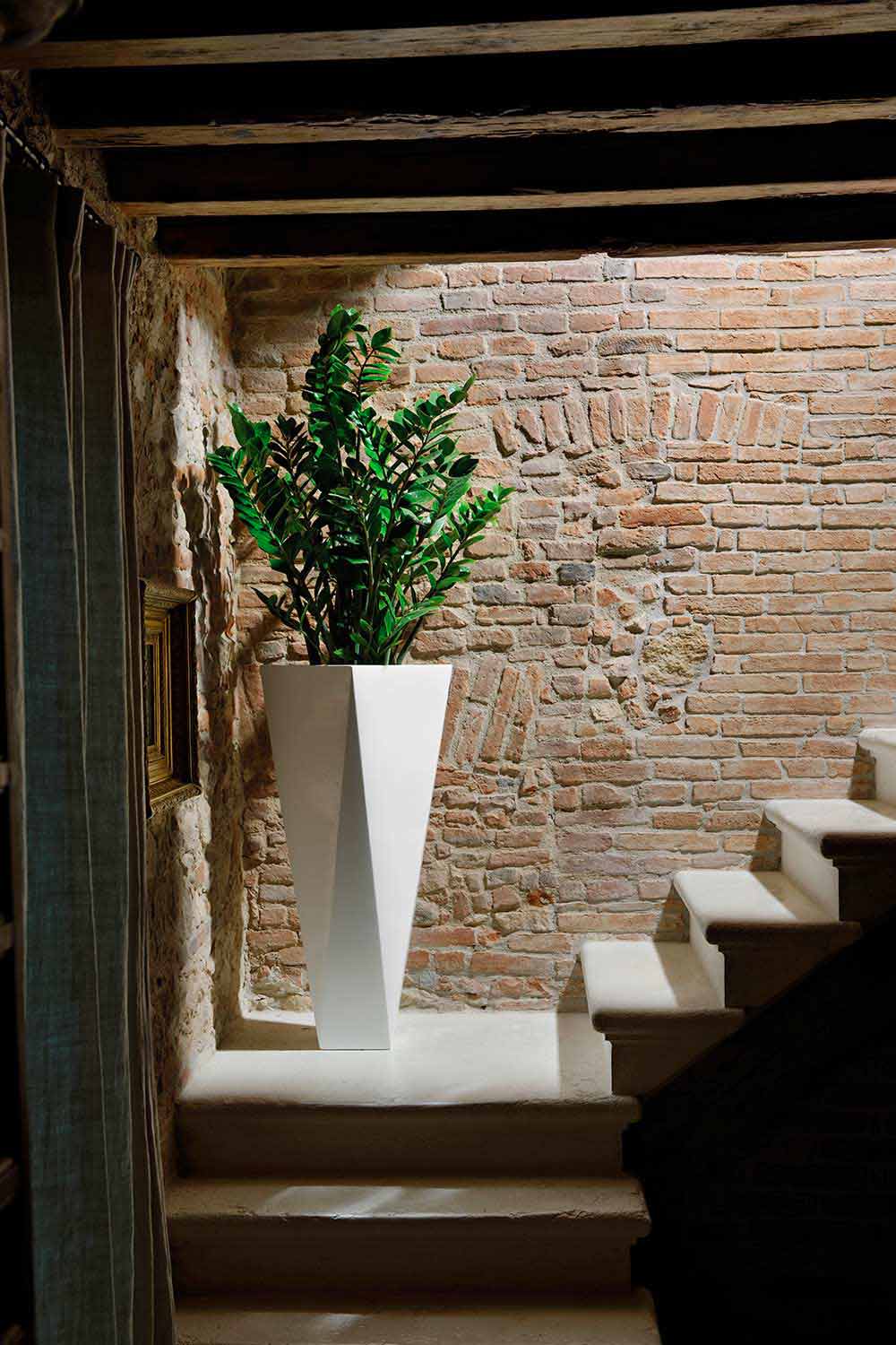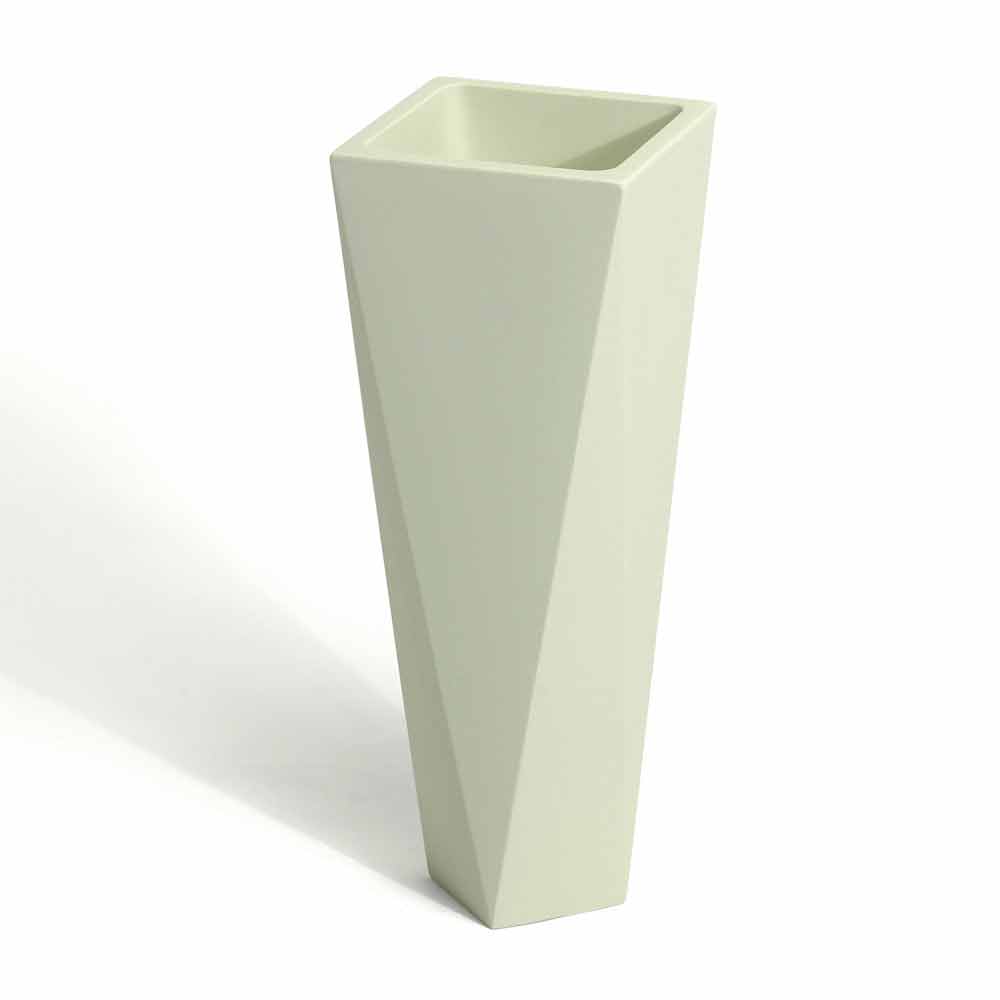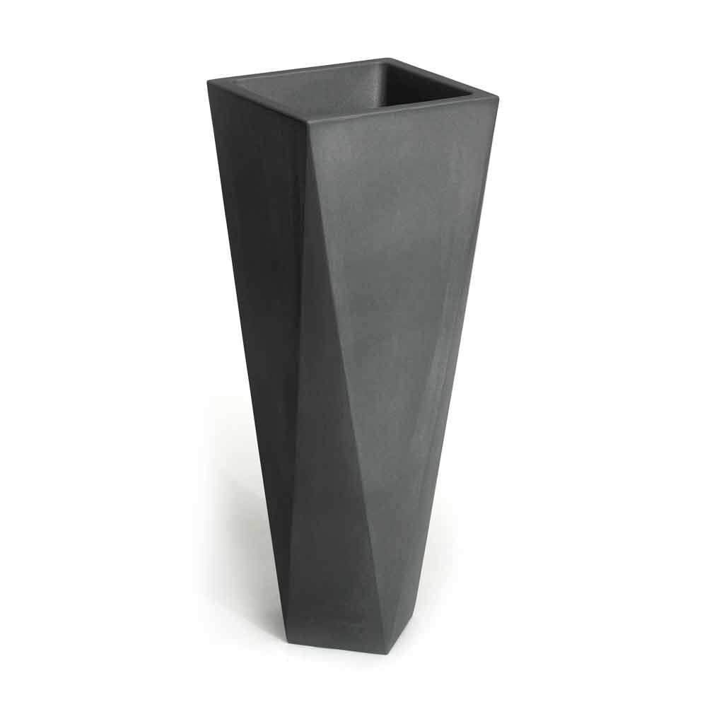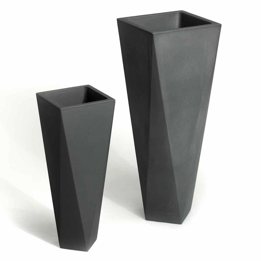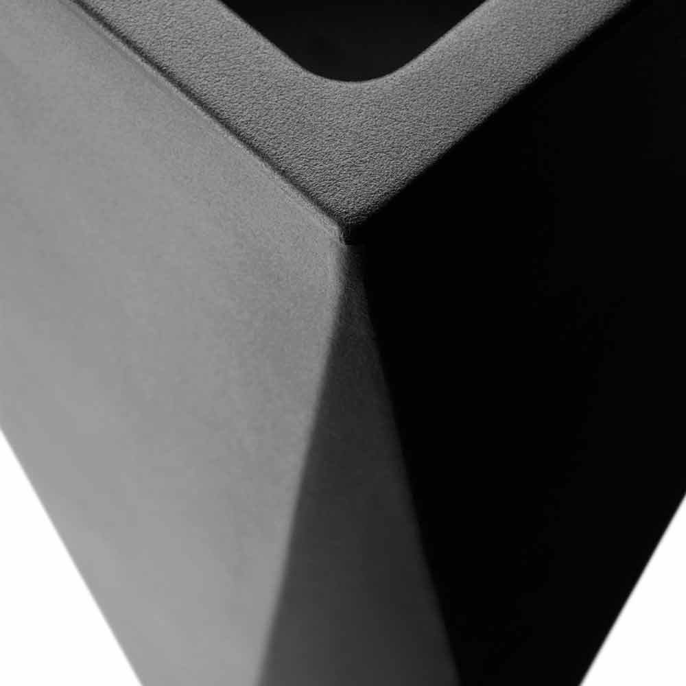 polietileni i disponueshëm në versionin e errët karakterizuar nga rezistencë e shkëlqyeshme ndaj diellit, goditjeve dhe nxehtësisë, në versionin rezistent dhe të llakuar të ndritshëm që ju lejon të krijoni lojëra të dritës dhe reflektime që ata të bëhen protagonistë brenda mjedisit ose, së fundmi, në versionin metalik. Ideale për bimë të mesme / të vogla, kjo vazo është në dispozicion në dy madhësi të ndryshme për të kënaqur çdo lloj nevoje dhe për tu përshtatur më mirë në situata të ndryshme mobilimi.