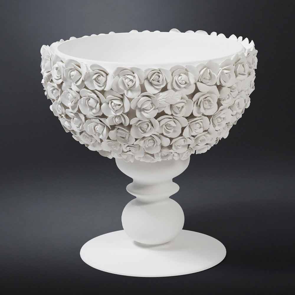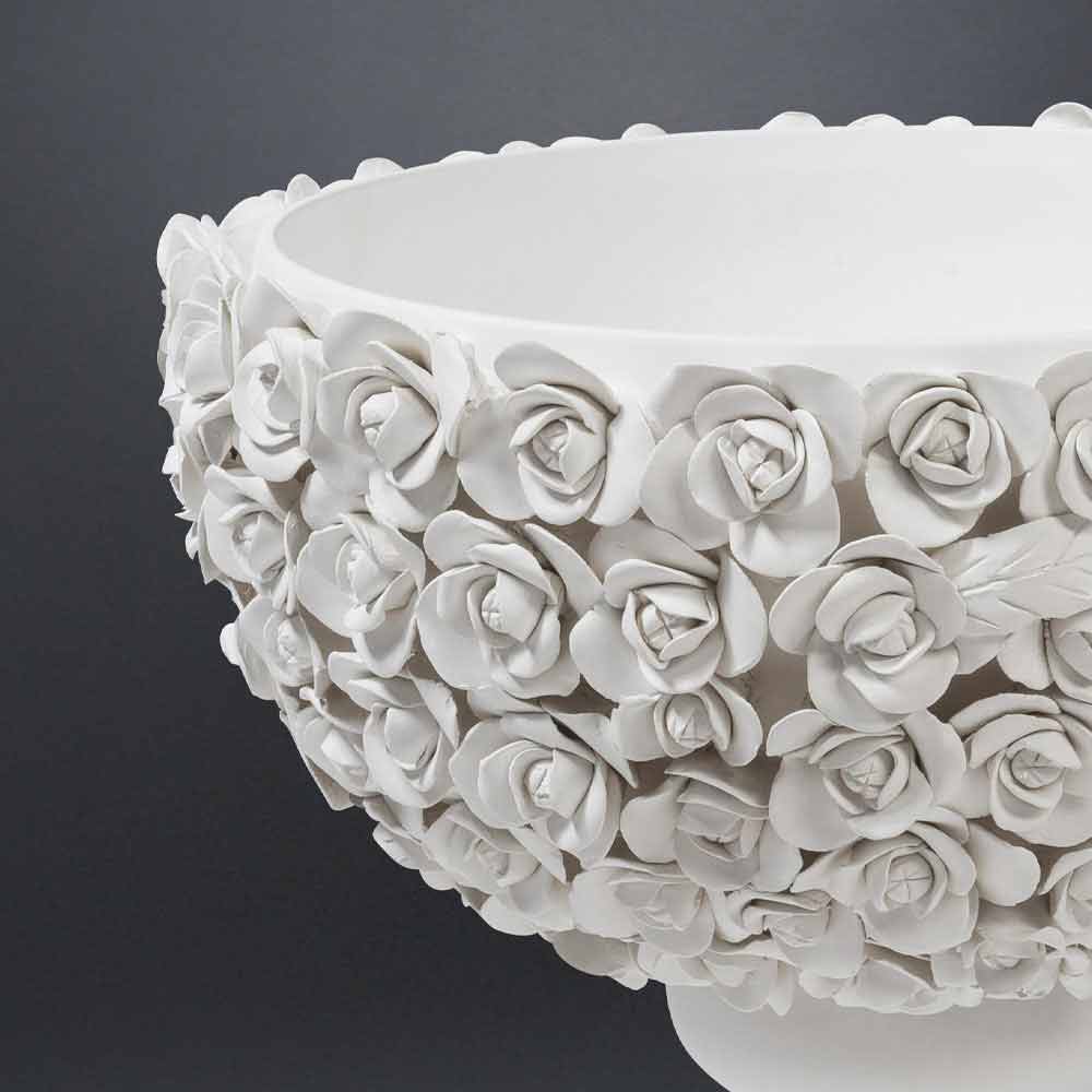 Vazo shtëpie në qeramikë të bardhë mat të punuar me dorë në Itali. Eleganca dhe stili klasik janë tiparet kryesore të këtij elementi të mrekullueshëm dekorativ, figura e të cilit nënvizohet nga linja të buta dhe të rrëmbyeshme për një model që sjell ndërmend skulptura antike tipike të artit italian. Për të pasuruar estetikën është përpunimi i veçantë i luleve që rrit edhe më shumë anën e rafinuar të produktit. Përdorimi i qeramikës dhe zejtarisë nënvizojnë vlerën dhe cilësinë e saj për një rezultat të aftë për t'iu përshtatur çdo situate stilistike. Një estetikë ideal për ambientet më të larmishme, nga orenditë e shtëpive deri tek ato të hoteleve, restoranteve, zonave të kontraktuara, llixhave por edhe si një mjedis për ngjarje dhe dasma.