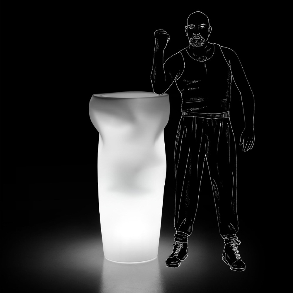 Vazo kopshti e ndriçuar e bërë tërësisht në Itali nga polietileni me ngjyrë me përfundim mat të kompletuar me komplet drite LED . Një mobilje origjinale dhe e gjithanshme që vjen nga një proces i veçantë në të cilin vazoja i nënshtrohet një trajtimi "kompresimi" kur materiali është ende pjesërisht i lakueshëm ose menjëherë pasi e keni nxjerrë nga myku. Kështu lind një element industrial që merr një estetikë të ndryshme herë pas here përmes një veprimi artizanal që prodhon pjesë unike. Fluiditeti i formave të pazakonta që rezultojnë kontribuon në shpërndarjen e një drite të butë, mikpritëse dhe gjithmonë të ndryshme për secilën llambë, unike por serike falë ndriçimit praktik dhe funksional LED që thekson vlerën dhe përsosjen e tij. E kompletuar me bazën e stabilizimit dhe fiksimit dhe tubin e kullimit .