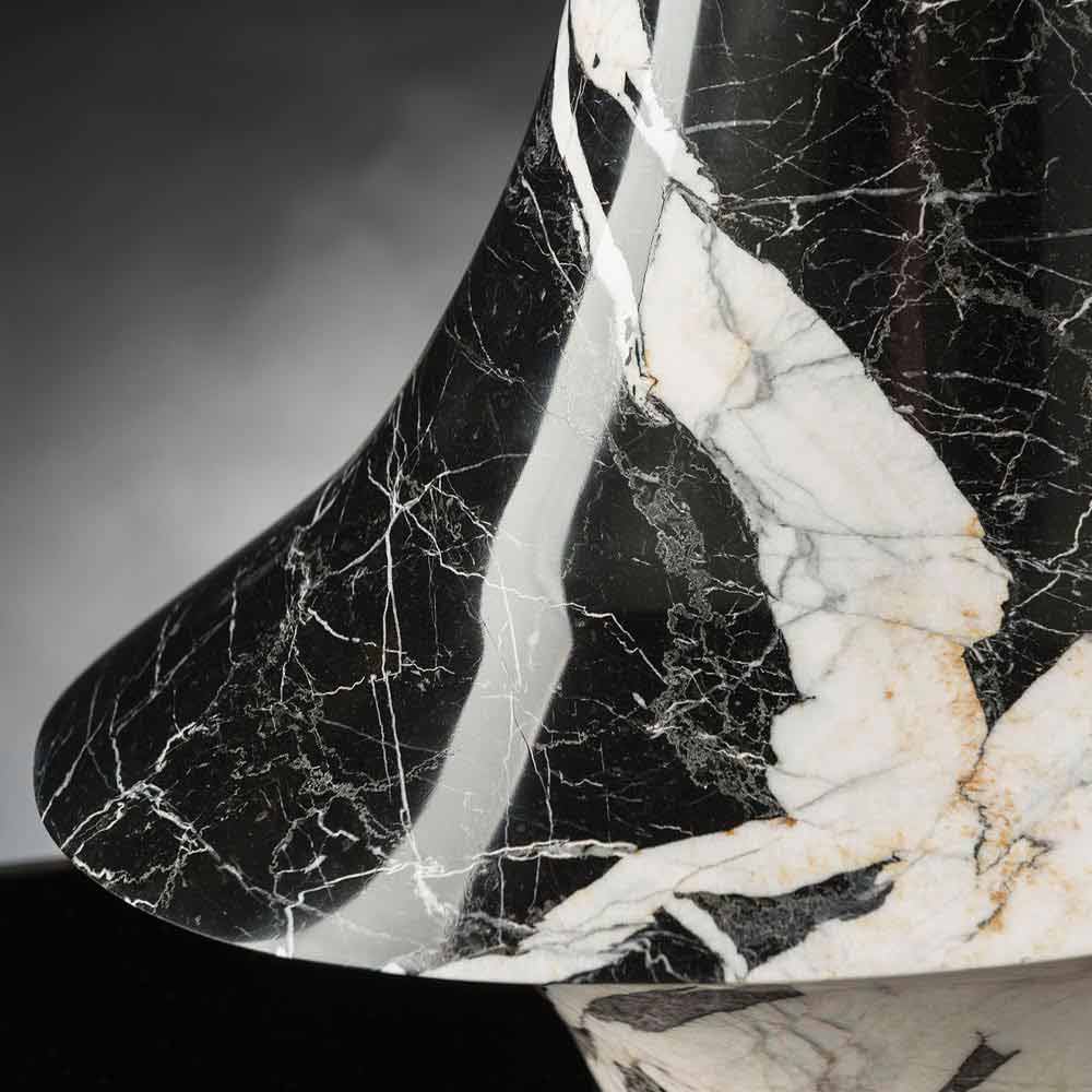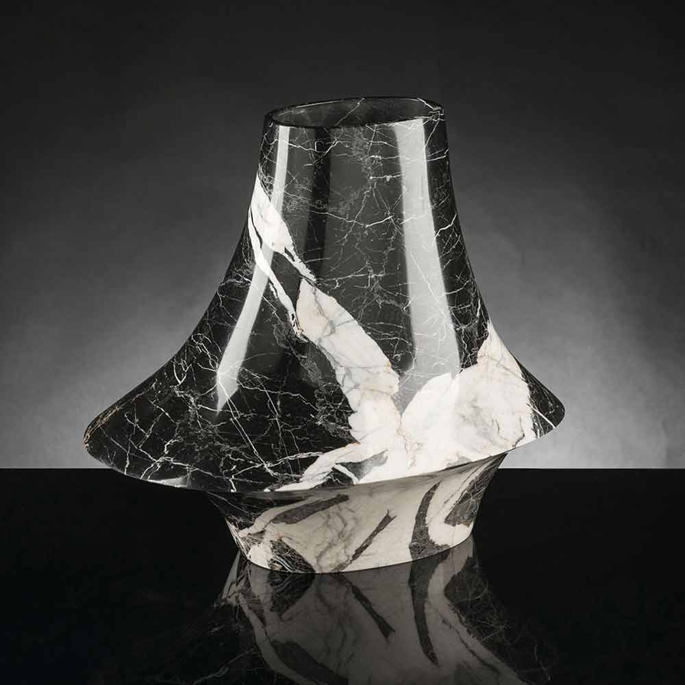 Vazo zbukuruese shtëpie e bërë prej mermeri të zi me damarë të bardhëpërmes një prodhimi 100% Made in Italy . Prodhimi i tij bëhet përmes përpunimit të gurëve natyrorë me pantografë me 5 boshte që lejojnë marrjen e formave më komplekse sesa vëllimet e thjeshta të rrotullimit. Kjo mobilje elegante vjen nga bashkimi midis studimit të fenomeneve natyrore dhe bashkëveprimit të materialeve të përdorura me teknologjinë njerëzore për t'i dhënë jetë një stili unik dhe avangard të mobiljeve. Rezultati është një element dekorativ ekskluziv i aftë të pasurojë çdo ambient me një estetikë moderne dhe të rafinuar me personalitet. Një stil ideal për ambientet më të larmishme, nga orenditë e shtëpive deri tek ato të hoteleve, restoranteve, zonave të kontraktuara, llixhave por edhe si një mjedis për ngjarje dhe dasma.