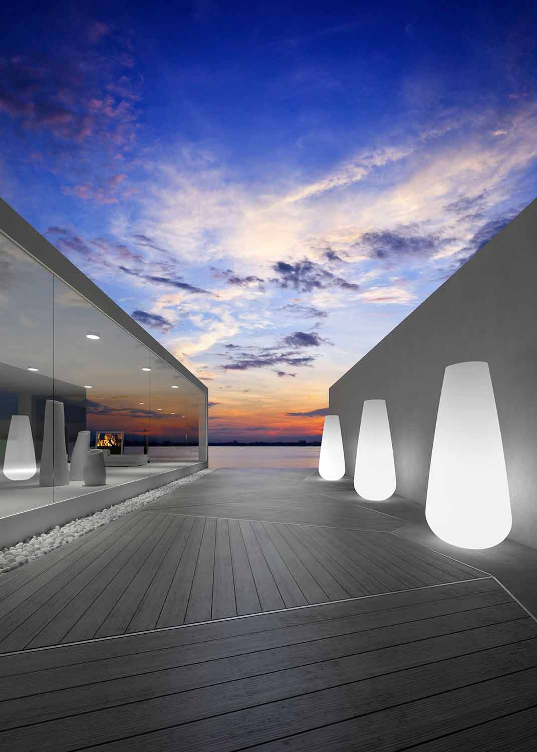 Kjo vazo dekorative karakterizohet nga prania e saj imponuese dhe nga drita LED që e bën atë të përshtatshme për krijimin e atmosferave të dritës së butë, duke ndihmuar në krijimin e zgjidhjeve mobiluese me ndikim të madh. Prodhuar tërësisht në Itali nga polietileni i karakterizuar nga rezistencë e shkëlqyeshme ndaj diellit, goditjeve dhe nxehtësisë, produkti gjithashtu përfshin kompletin LED të dritës së ftohtë me llambë të klasës 20W A, guaskë polikarbonate, kabllo të zezë të gjatë 280 cm dhe spinën e spërkatjes. Ideale për bimë të mesme ose dekorime perimesh me zhvillim vertikal.