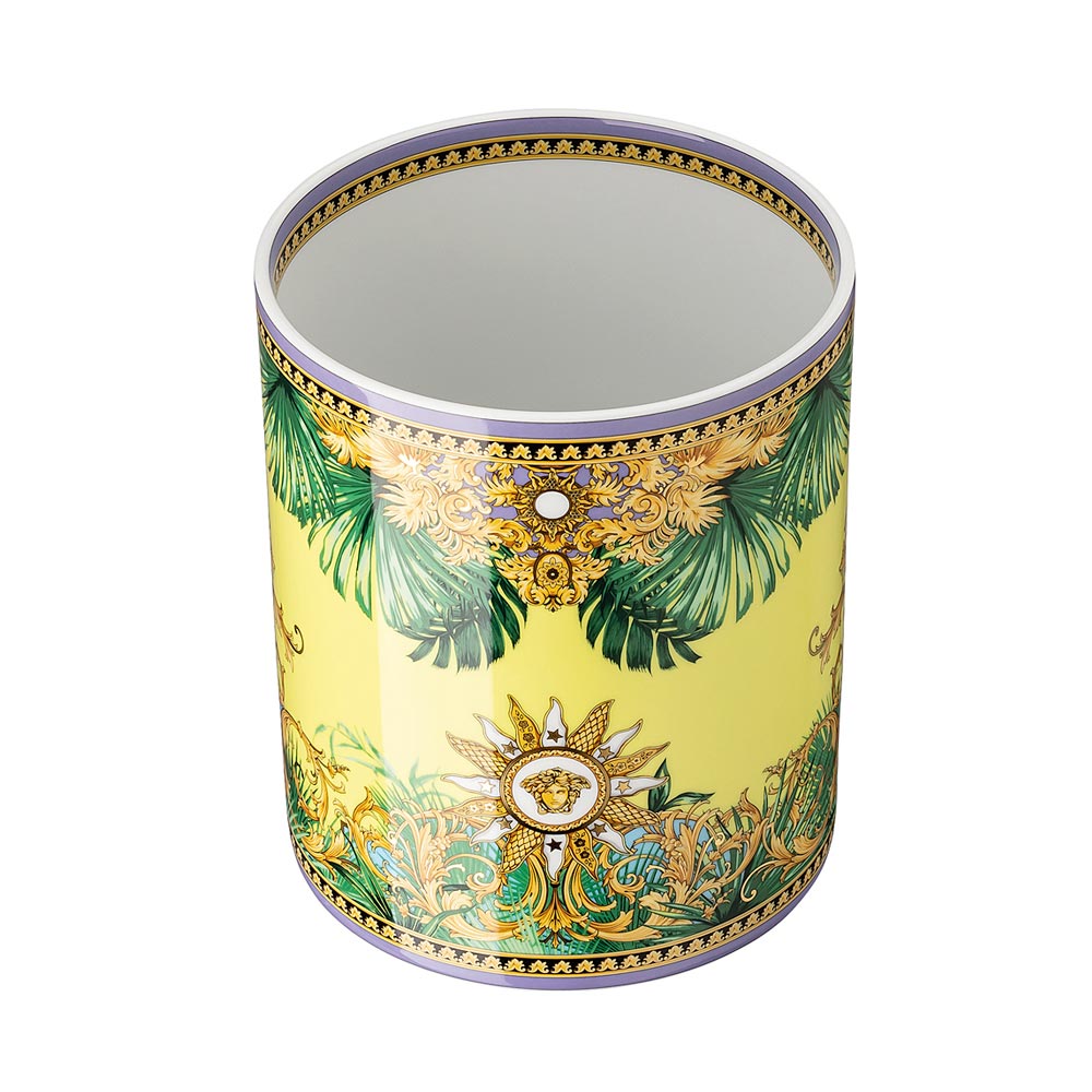 Vazo Jungle Animalier nga Versace , e punuar nga porcelani i imët , është një kryevepër që ndërthur elegancën ekzotike dhe luksin e përjetshëm. Dizajni mahnitës përmban një të verdhë të gjallë, të zbukuruar me motive tropikale të gjetheve të harlisura dhe detaje të ndërlikuara barok, të gjitha të përshtatura nga simboli legjendar Medusa në qendër, të vendosur në një diell të shndritshëm dhe të zbukuruar me detaje ari.