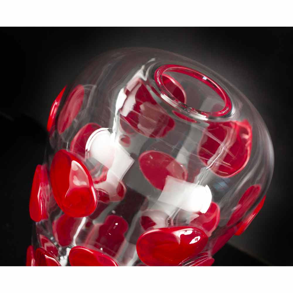 Vazo elegante për ambiente të brendshme në xham të hapur Murano me detaje të rrumbullakëta në të kuqe të ndezur e bërë përmes një procesi tërësisht Prodhuar në Itali . Një plotësues që ndërthur elegancën ekstreme të xhamit Murano dhe tiparet e tij të mrekullueshme me një dizajn modern dhe të gjallë për t’i dhënë jetë një ideje mobiljesh ekskluzive dhe avangarde të afta për të pasuruar çdo hapësirë shtëpiake dhe jo me një prekje të ngjyrës . Një stil ideal për ambientet më të larmishme, nga orenditë e shtëpive deri tek ato të hoteleve, restoranteve, zonave të kontraktuara, llixhave por edhe si një mjedis për ngjarje dhe dasma.