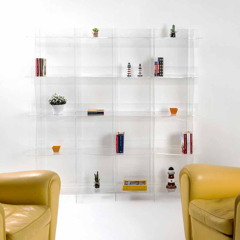 Veshmbathje moderne e vendosur në rafte Pam, mbarim transparent Pamja e librave, karakterizohet nga një dizajn minimal. Librat duken të lundrojnë në zbrazëti. Shtë një raft librash i pavarur por mund të jetë i fiksuar në mur. Karakteristikat e pleksiglës (izolim termik i papërshkueshëm nga uji, i papërformueshëm, i pandryshueshëm, izolimi termik) e bëjnë këtë artikull një pjesë mobiljesh shumë të gjithanshme. Shkëlqimi dhe shkëlqimi i saj mbeten konstante dhe të pandryshuara me kalimin e kohës. Plexiglasa PMMA nga polimeret e virgjëra të përdorura është jo toksike, hipoallergjike, pa erë dhe anti-bakteriale. 100% e riciklueshme, përputhet me UNI EN 71-3: 200. Projektuar , zhvilluar dhe prodhuar nëItali me materiale italiane .