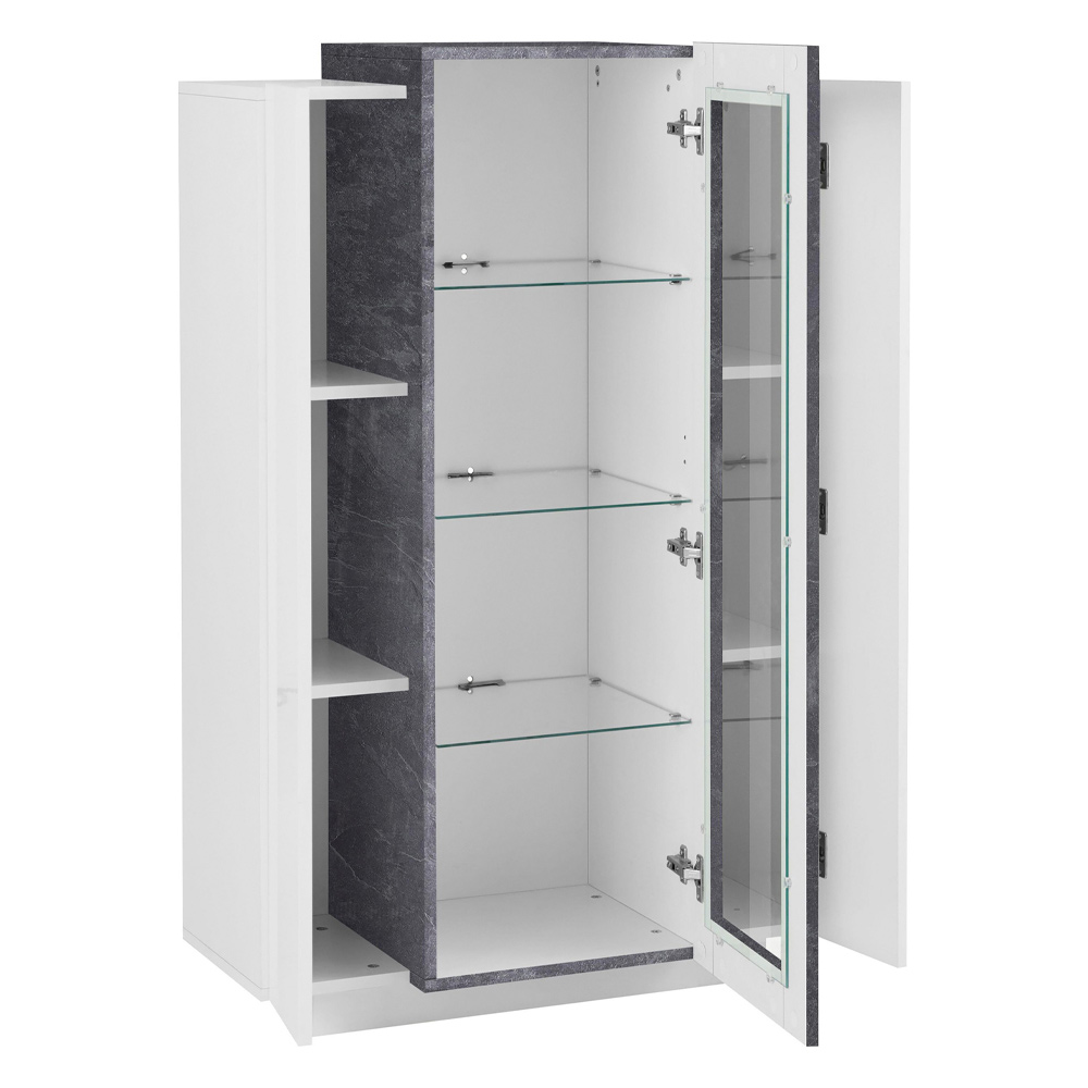 Vitrina për dhomën e ndenjes karakterizohet nga dizajni i saj i thjeshtë dhe thelbësor, i disponueshëm në përfundime të ndryshme dhe me 3 drita LED opsionale të bardha për xhamin me prizë Schuko dhe transformator të përfshirë.