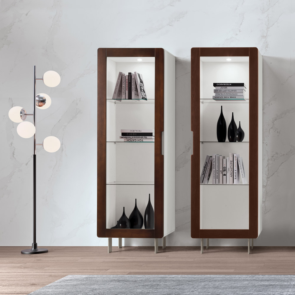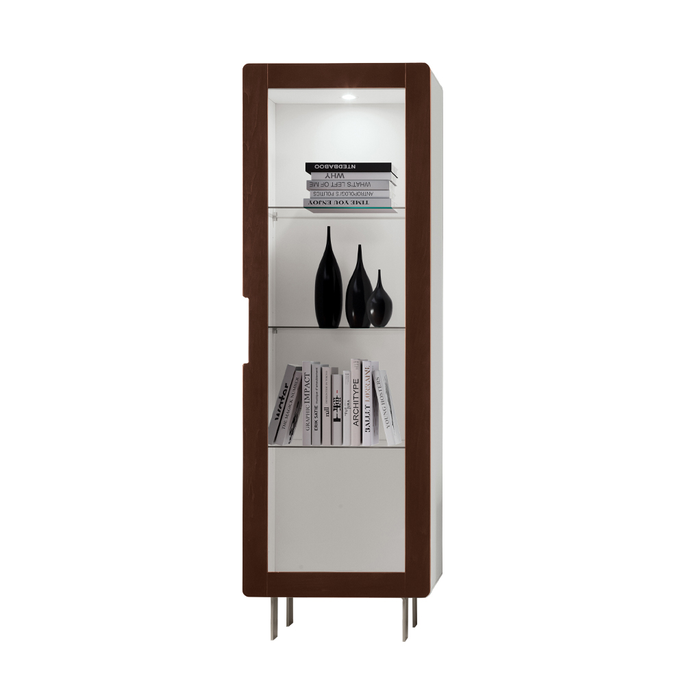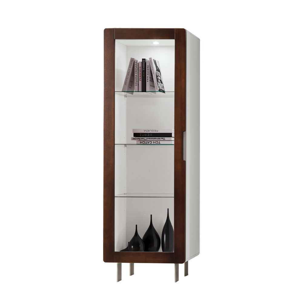 Vitrina për dhomën e ndenjes karakterizohet nga dizajni i saj i thjeshtë dhe thelbësor, perfekt për arredimin e dhomës së ndenjes, korridorit, dhomës së gjumit dhe të gjitha dhomave të tjera. Kjo vitrinë përbëhet nga këmbë hekuri me finiturë nikel , guaskë MDFme finiturë të bardhë dhe derë xhami me kornizë të jashtme prej druri të ngurtë tulipani me përfundim Canaletto dhe 3 rafte xhami të brendshëm.