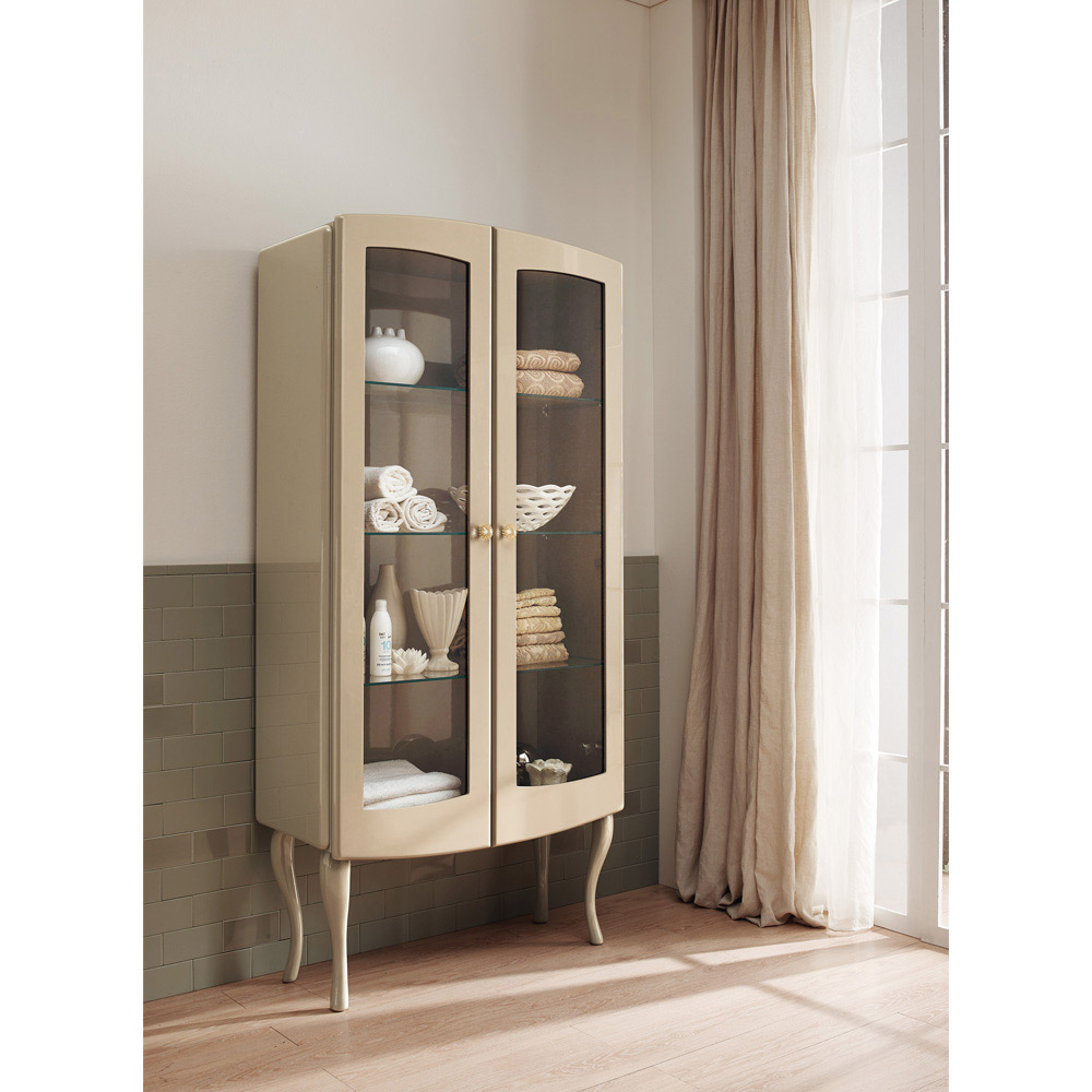 Vitrine h 180cm ne MDF e kompletuar me dy dyer me tre raftexhami te brendshem . Vitrina është në llak , një ngjyrë të purpurtme shkëlqim nga jashtë dhe mat me llak nga brenda. Përfshihen pullat prej bronzi në formë luleje.