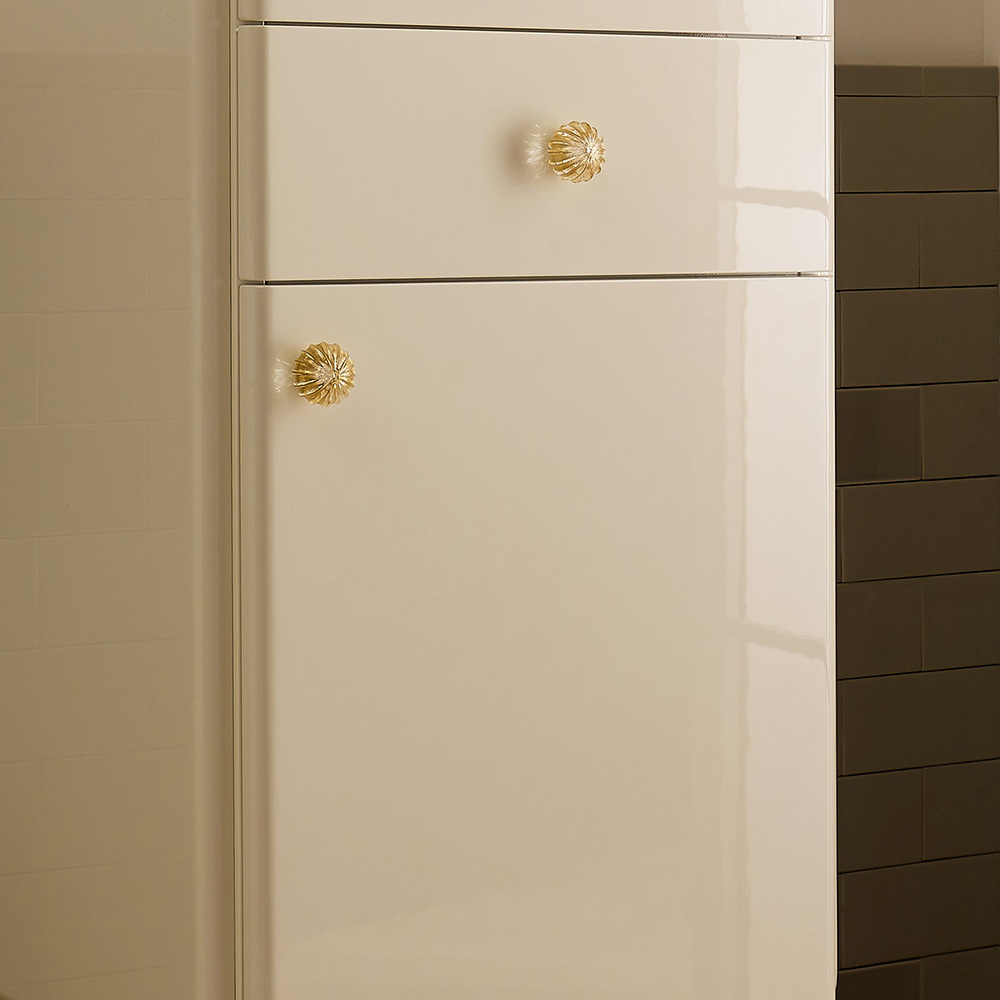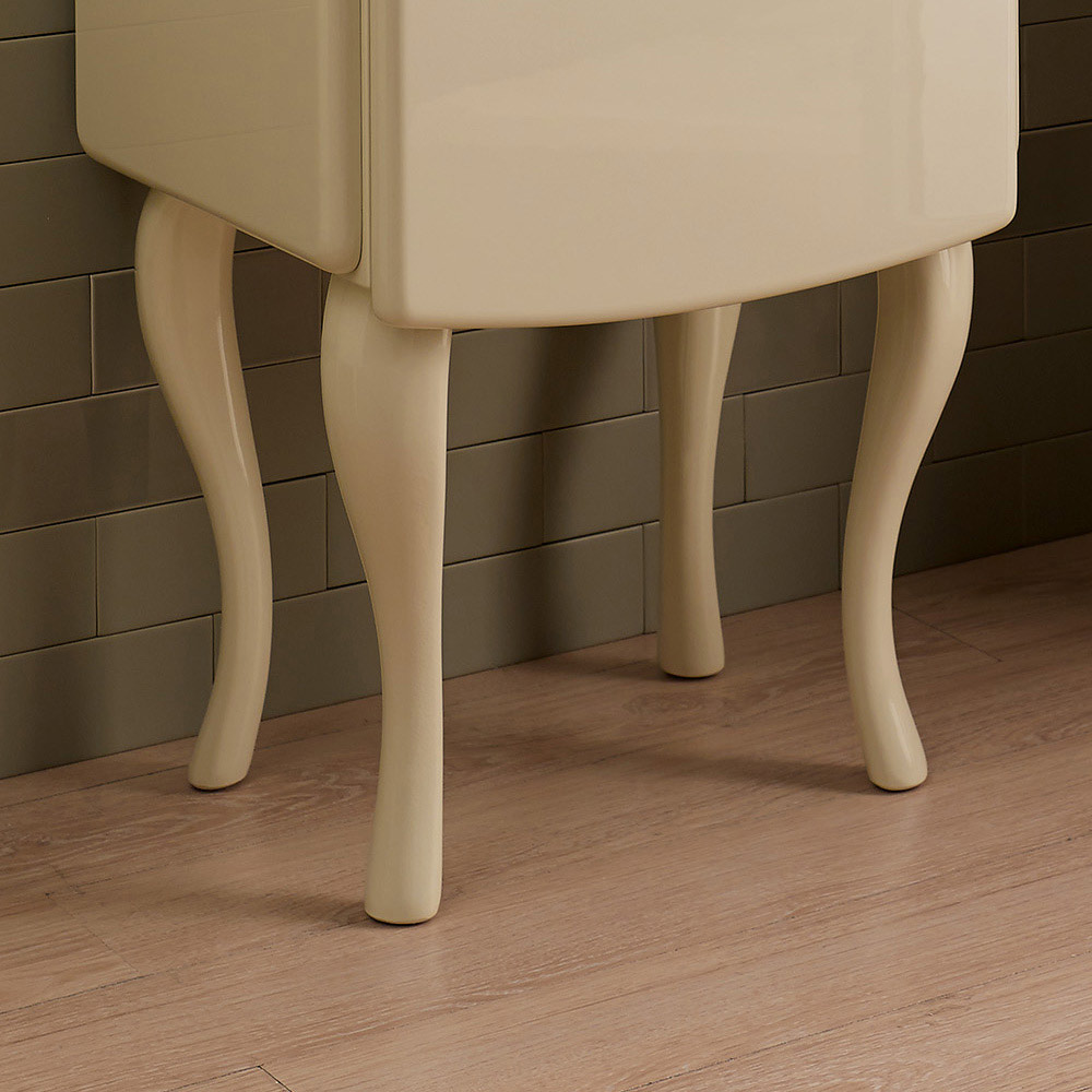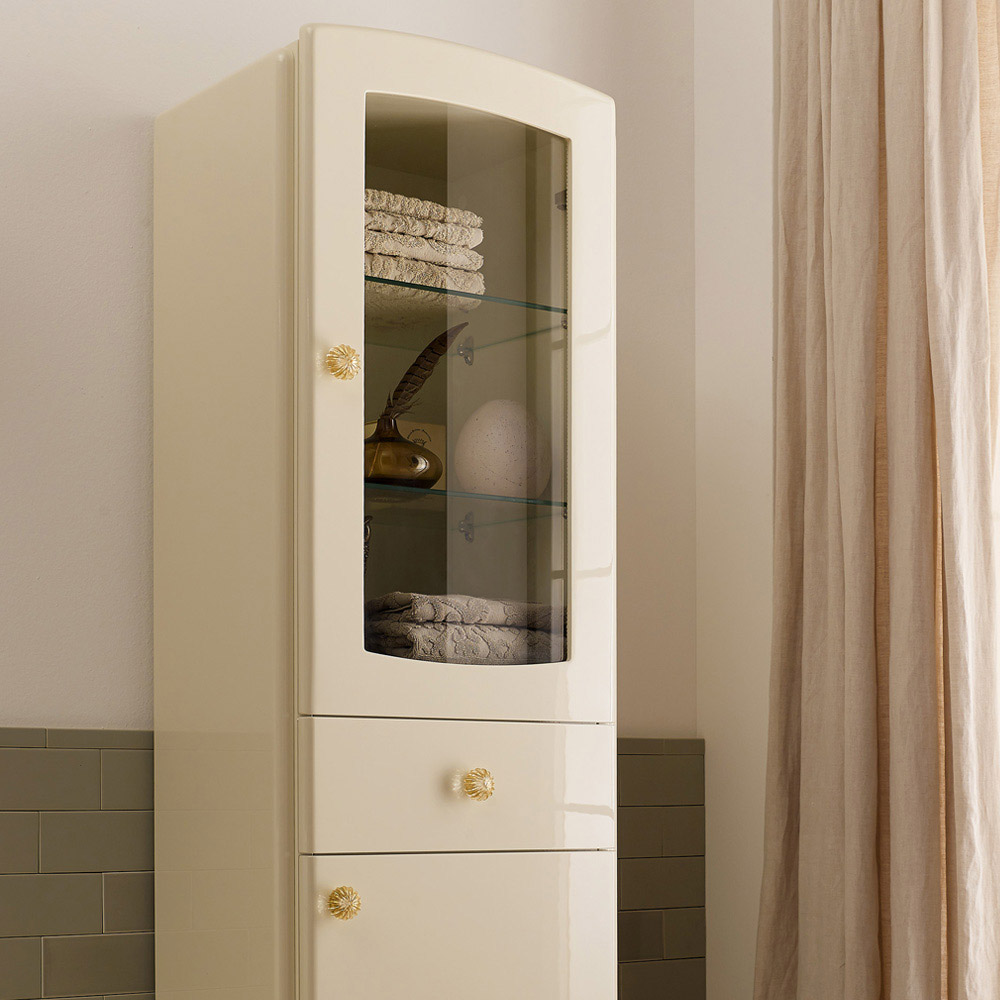Vitrina h 180cmnë MDF e kompletuar me dy dyer , njëra prej të cilave me xham që mbyll 2 rafte xhami dhe një sirtar në qendër . Vitrina është në një ngjyrë fildishi me shkëlqim të llakuar nga jashtë dhe mat e llakuar nga brenda me pulla bronzi në formën e një luleje të artë të përfshirë.