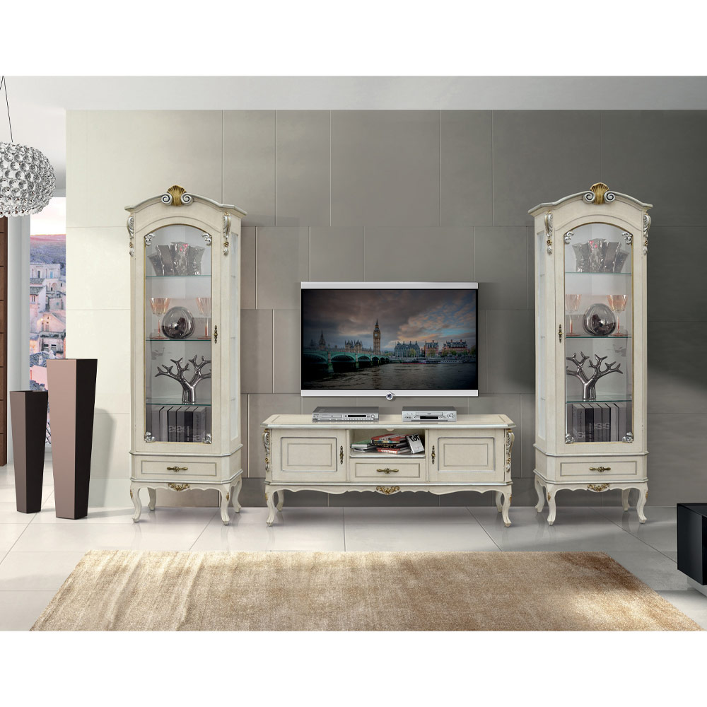 Ekspozita luksoze e stilit klasik , prej druri të bardhë të çmuar me derë dhe sirtar praktik, i disponueshëm në versionin me derë që hapet djathtas ose majtas, i përshtatshëm për çdo nevojë mobilimi. Elegant dhe pa kohë, ky dollap ekrani i stilit klasik është ideal për të krijuar ambiente mbresëlënëse. Prodhuar tërësisht në Itali dhe punuar me dorë nga mjeshtra të aftë , të përfunduara me mençuri dhe shije për elegancë. Prodhimi kryhet duke përdorur materiale të shkëlqyera , dhe duke kryer punënmedorë me kujdesin dhe profesionalizmin maksimal që i dallon produktet Made in Italy .