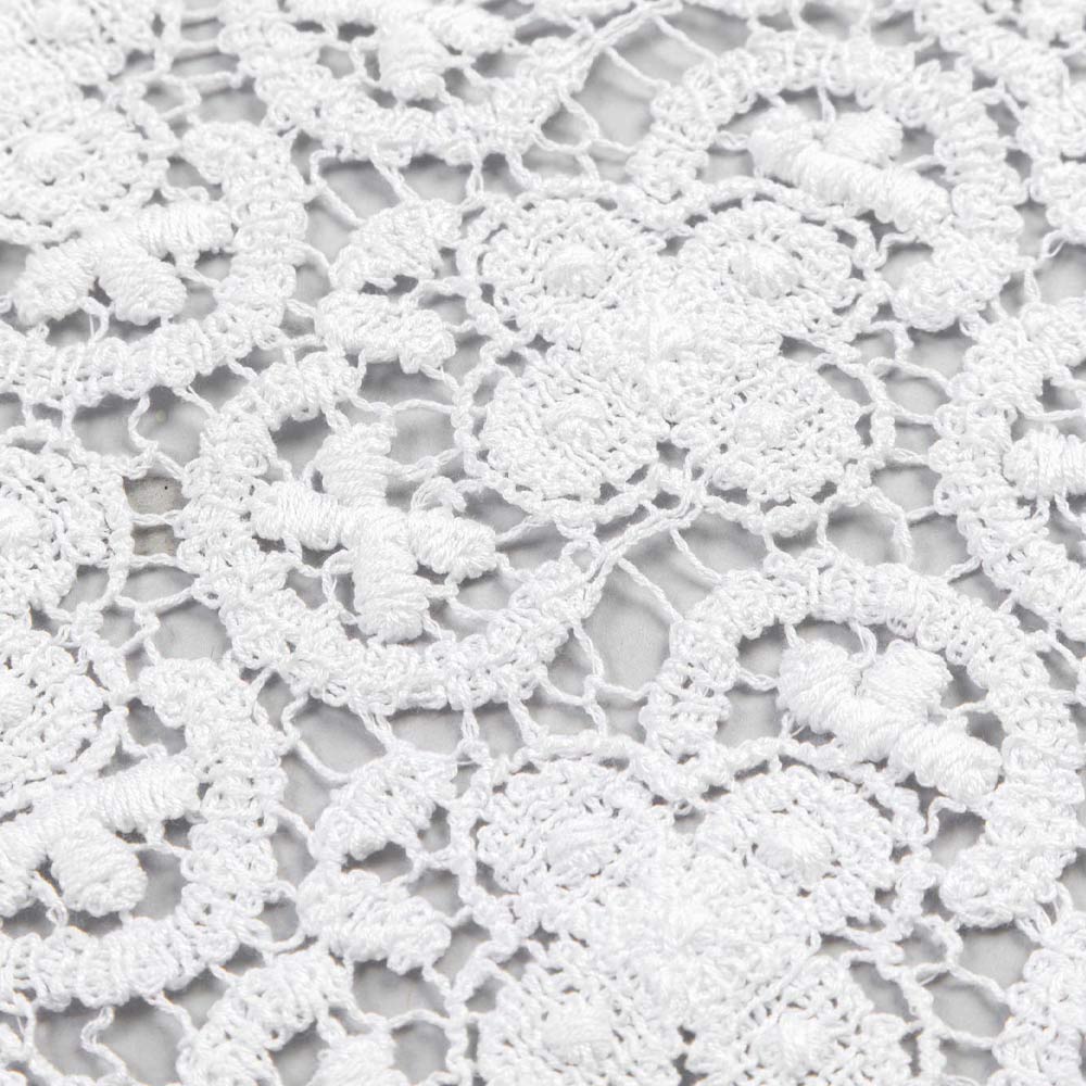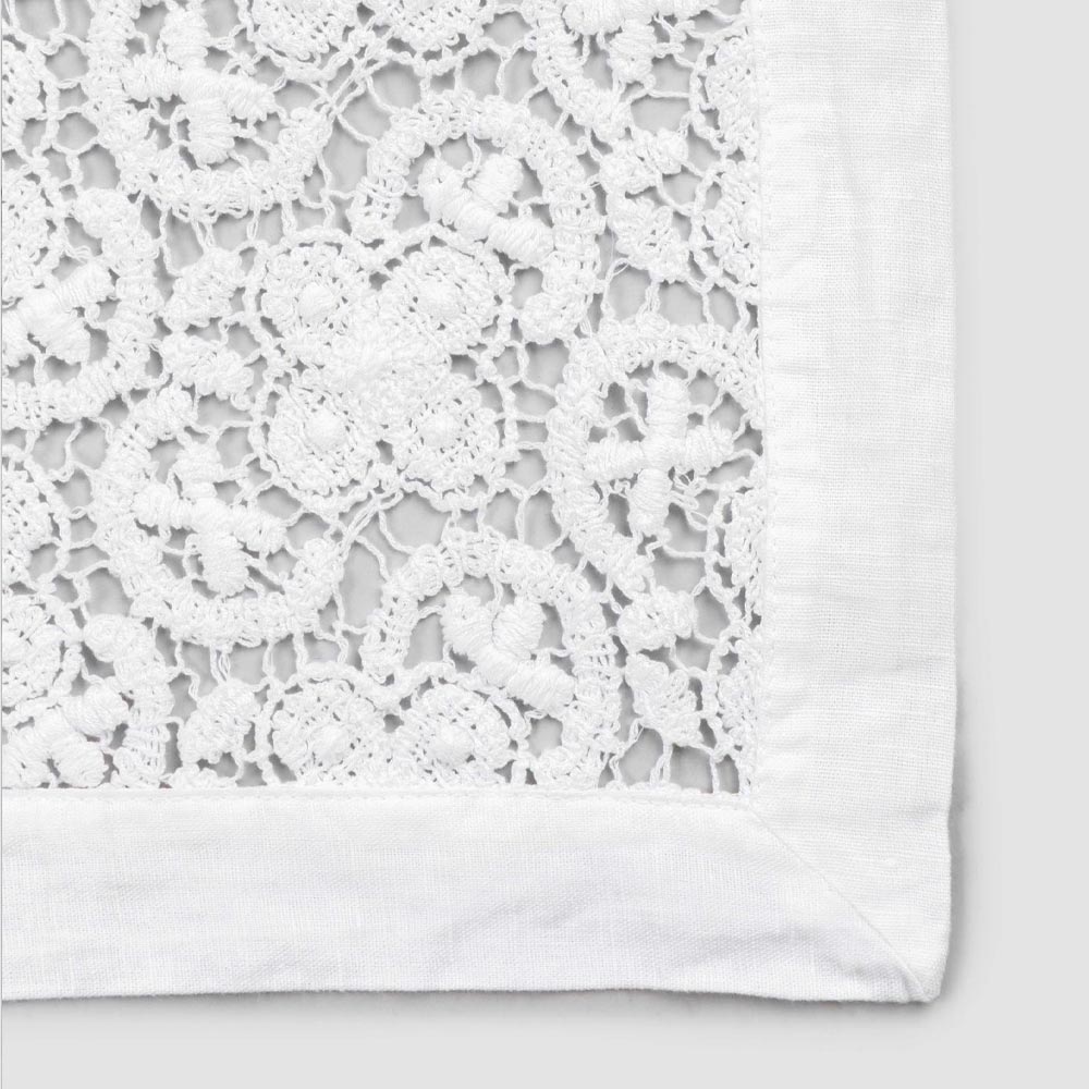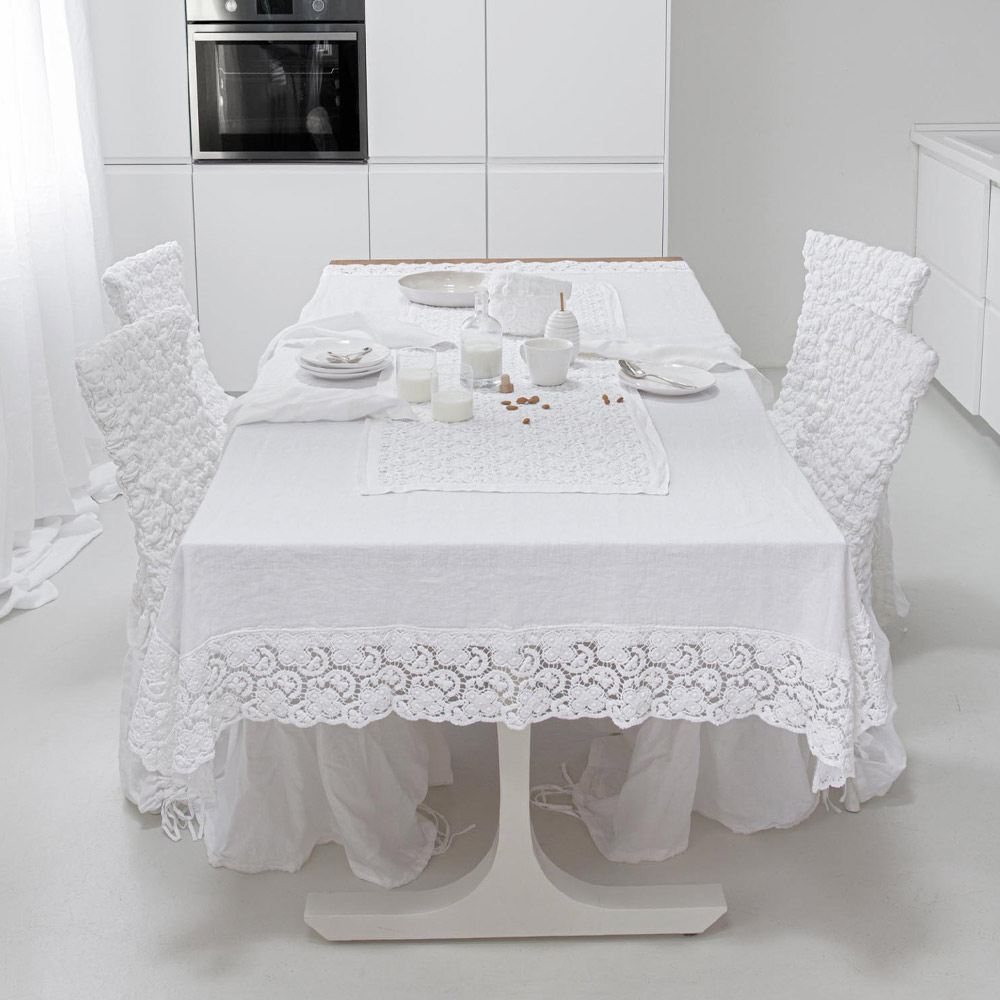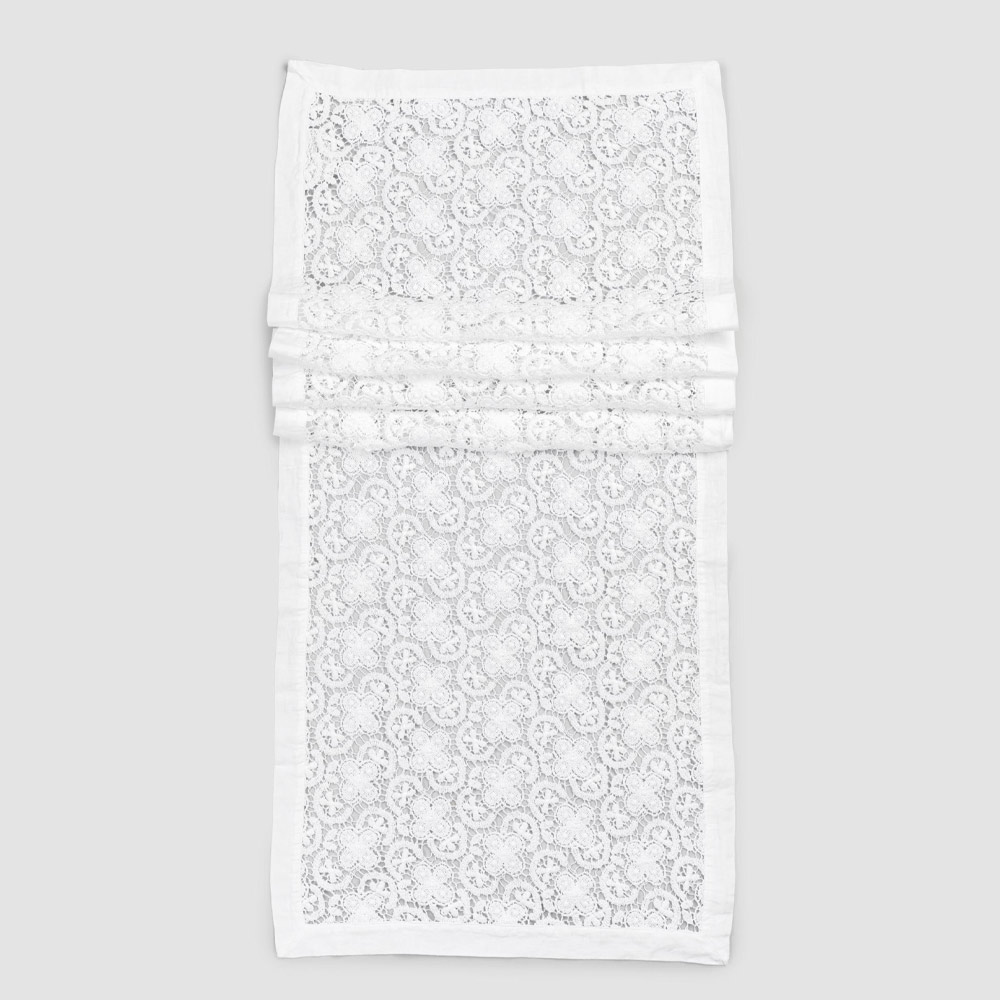 Vlera e traditës bashkohet me stilin e jetës moderne me këtë vrapues tavoline me cilësi të lartë të bërë i butë në prekje falë trajtimeve të veçanta që rrisin pamjen natyrale. Vrapuesi i dekorimit të bardhë është i qëndisur tërësisht në dantella me grep dhe përmban një kufi të përzierjes prej liri dhe pambuku me rrudha. Lehtësia , liria, eleganca dhe pastërtia janë fjalët kryesore që përmbahen në këtë produkt me një bukuri fisnike dhe pëlhurë të hollë .