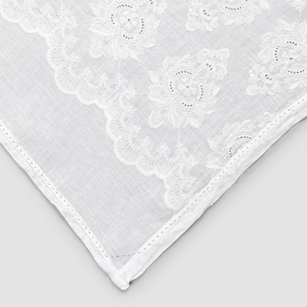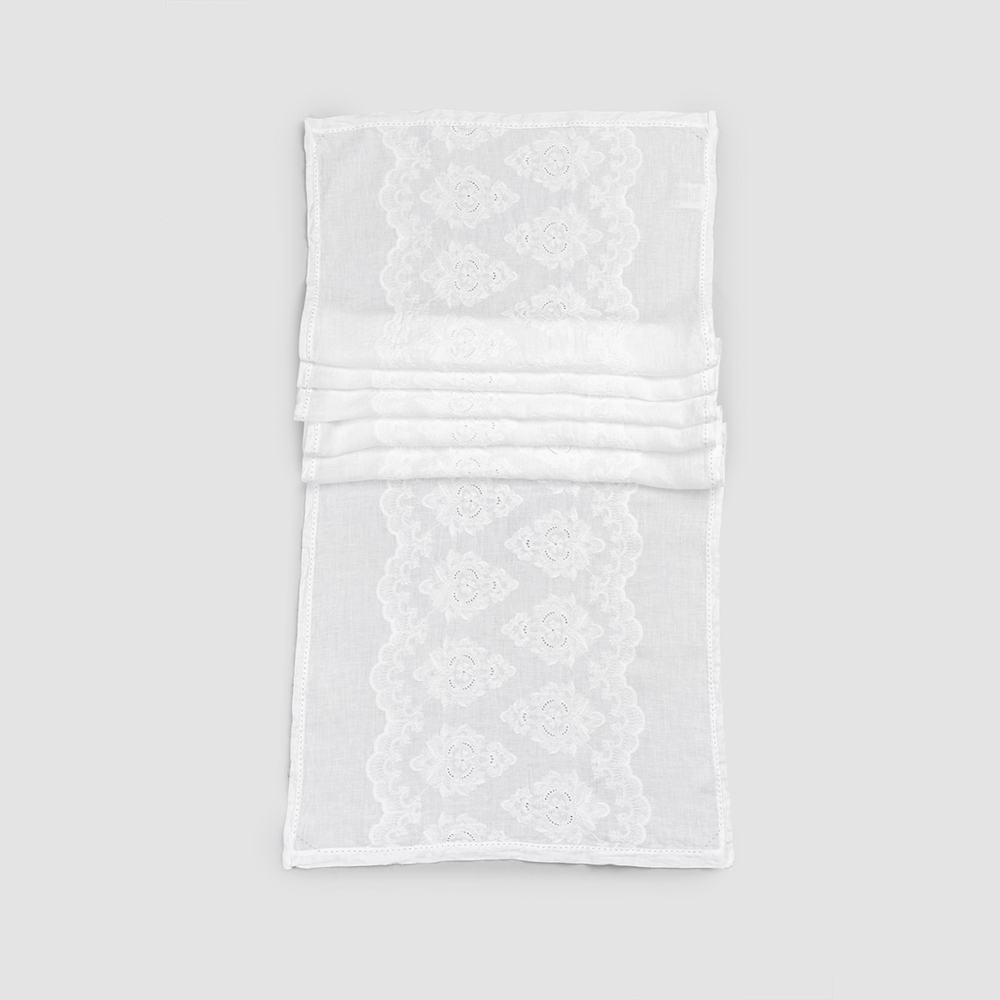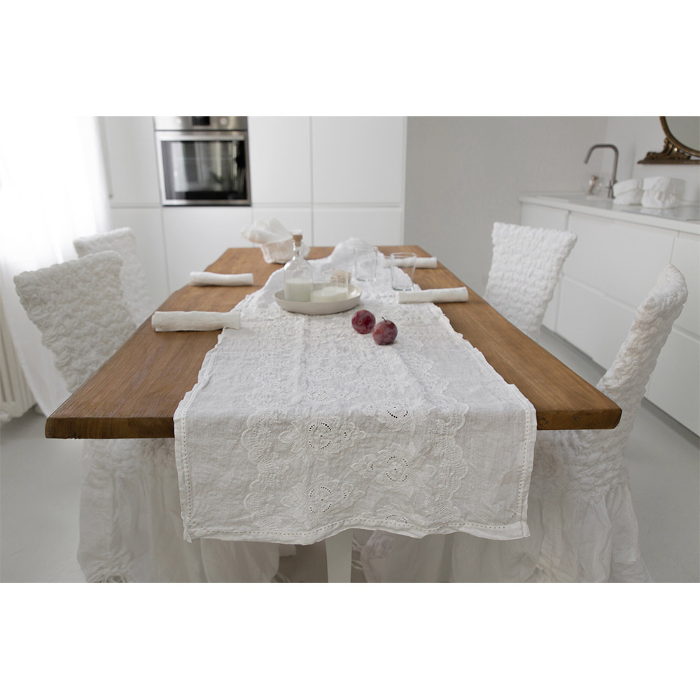 Vrapues i pastër tavoline prej liri me qëndisje pambuku, dizajn elegant luksoz i prodhuar në Itali.