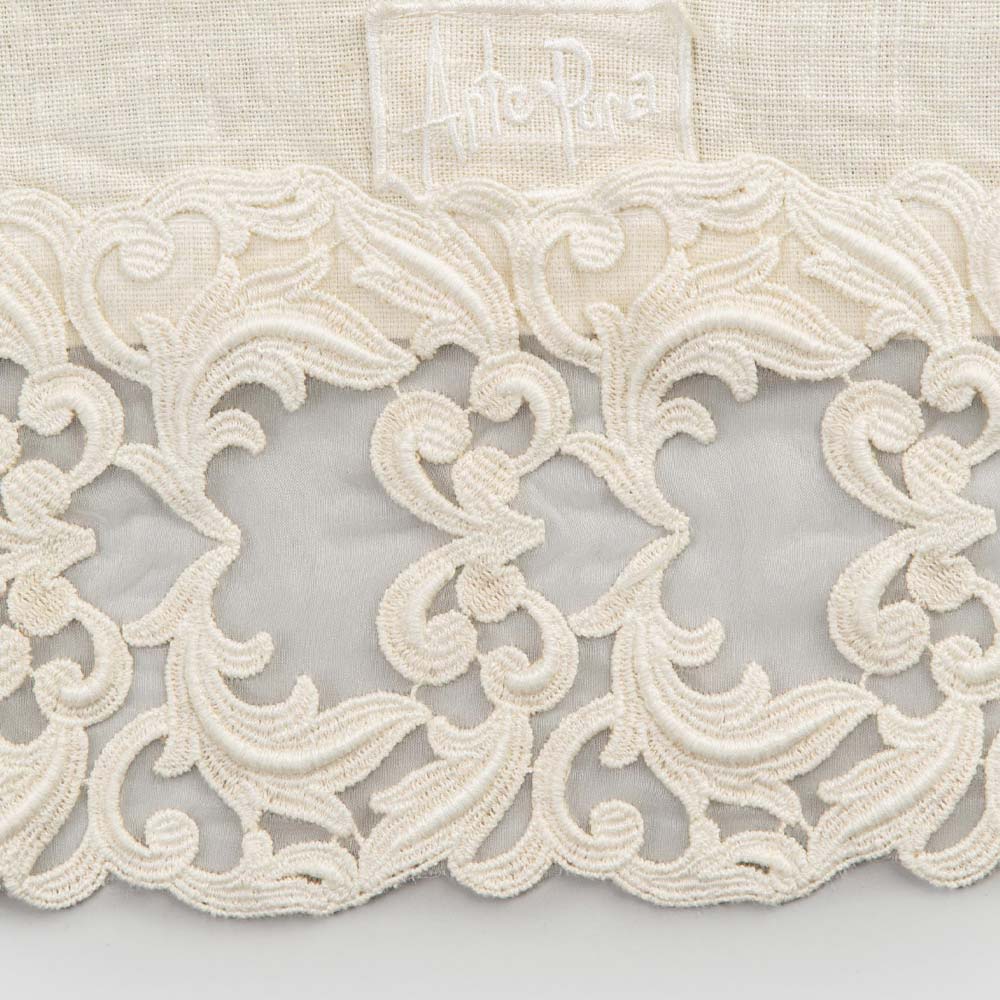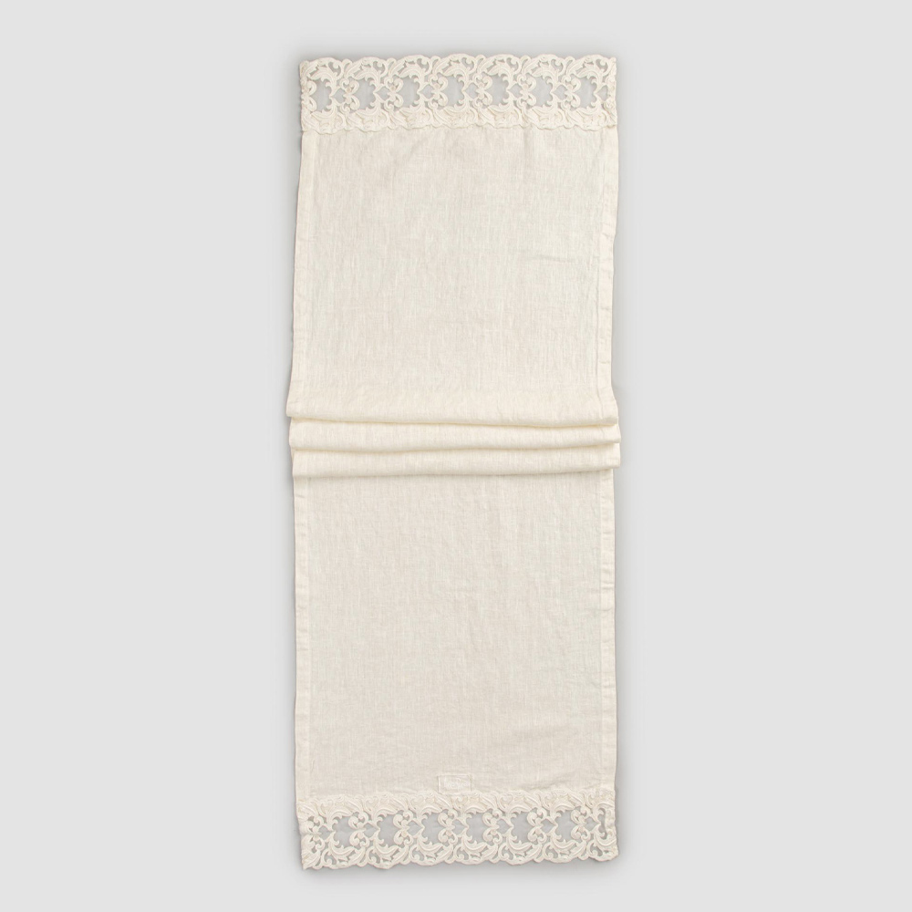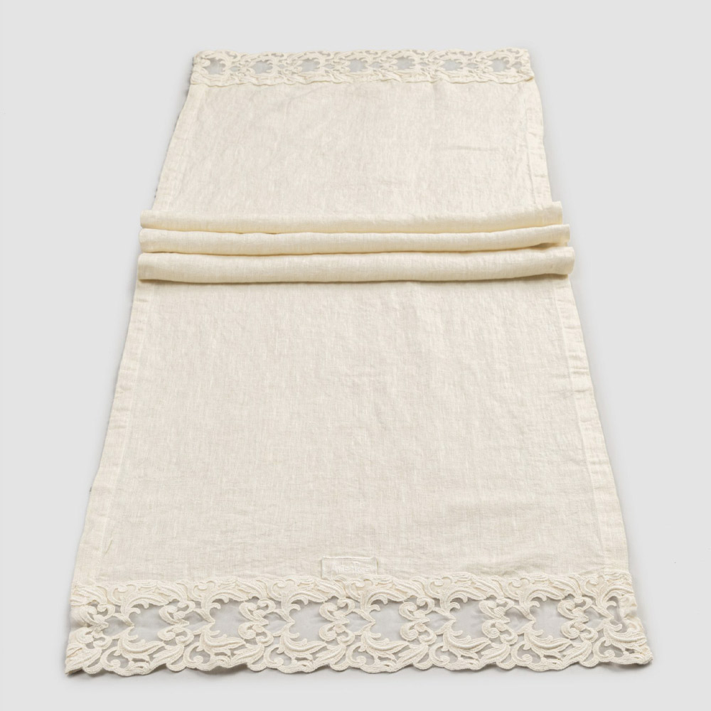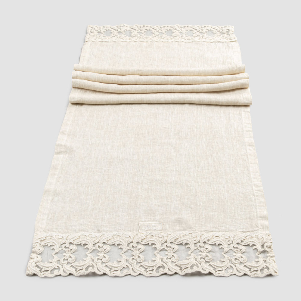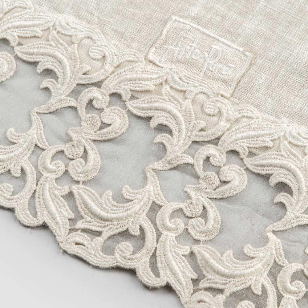 Vrapues i tavolinës së rëndë prej liri me dantella dhe buzë të palosur, luks i prodhuar në Itali.