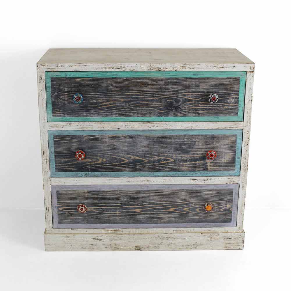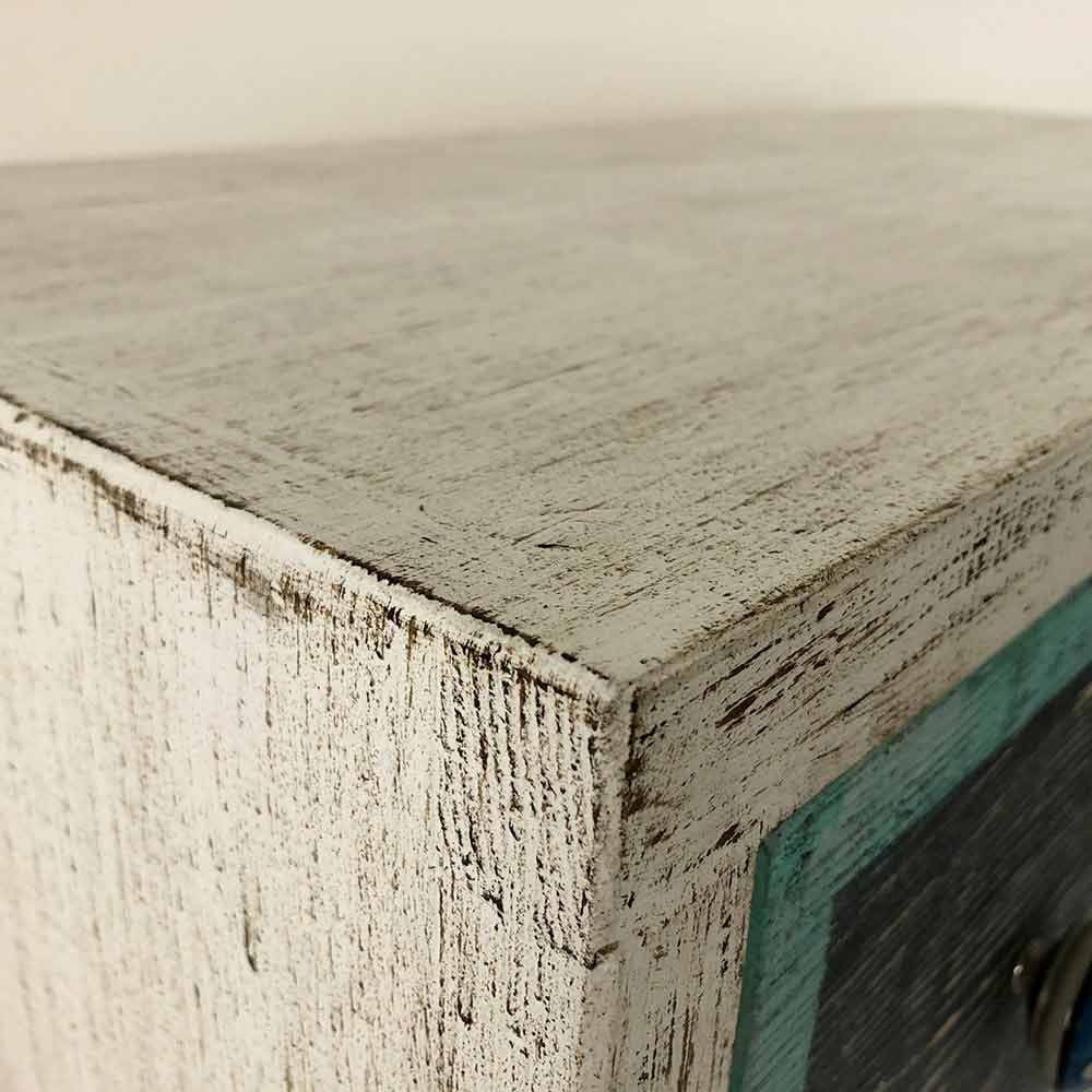Sirtarë të punuar me dorë të prodhuar në Itali në dru bredhi të ngurtë me 3 sirtarë në kompensatë plepi me pjesën e përparme prej druri të pikturuar me dorë dhe çelësat qeramikë. Struktura e produktit ka një fund të bardhë të moshuar, ndërsa sirtarët janë zbukuruar në të zezë të skuqur me buzë me ngjyra. Këto ngjyra të mrekullueshme merren falë përdorimit të tokave natyrore të grumbulluara me ngjitësa me origjinë shtazore, materiale të zgjedhura si një alternativë ndaj bojrave të zakonshme industriale. Kjo është bërë në një përpjekje për të minimizuar përdorimin e formaldehidit, një substancë e dëmshme e njohur si kancerogjen. Në këtë mënyrë është e mundur të ulet niveli i toksicitetit, duke krijuar kështu një produkt funksional dhe magjepsës dhe një atmosferë më të shëndetshme. Sirtarja përfundimisht përfundon me një fund transparent që e bën atë të papërshkueshëm nga uji dhe rregullon ngjyrat për t'i bërë ato të pandryshueshme me kalimin e kohës.