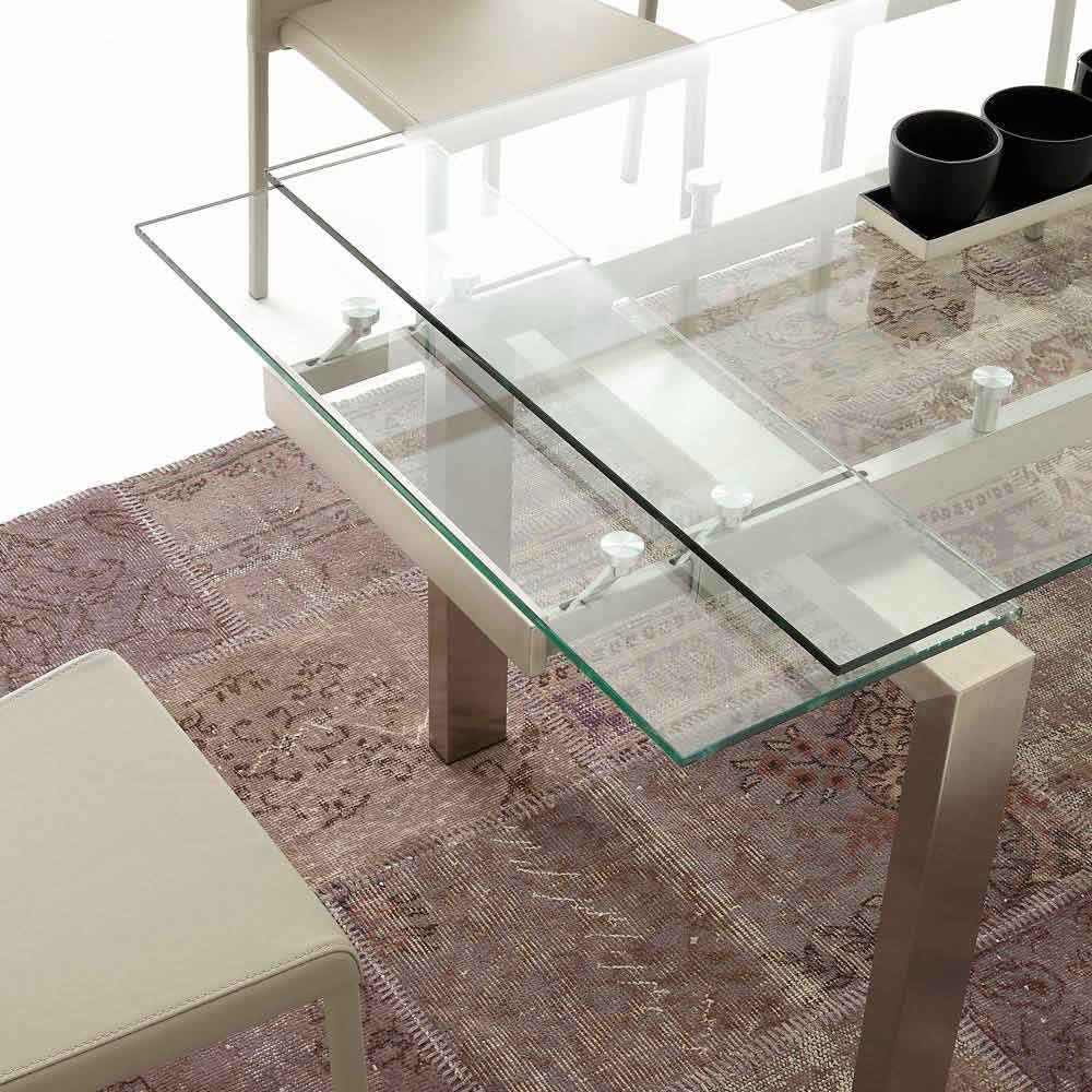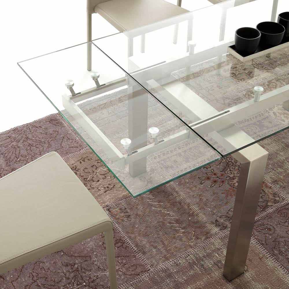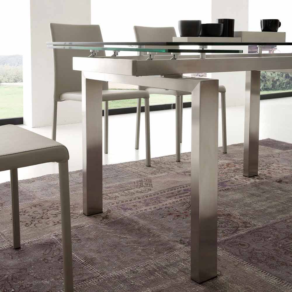 Tavolinë ngrënieje moderne me kornizë çeliku të pandryshkshëm dhe majë xhami të tejdukshme transparente (10 mm).
